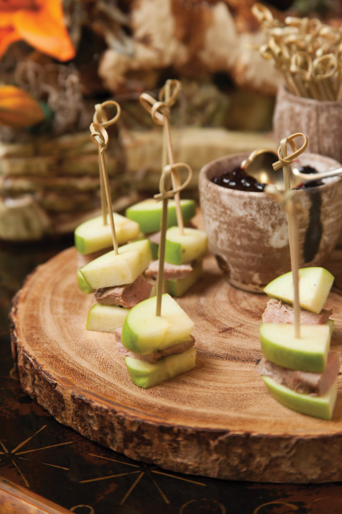 1. Place a piece of duck breast between two similar sized pieces of apple. Secure with a toothpick. Place on a platter and drizzle each “stack” with Blueberry Chutney. Serves 6 – 8.