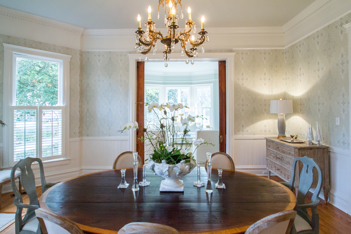 ABOVE Wallpaper with neutral shades and metallic glimmer accentuate detailed woodwork in Johannah and Ty Bullard’s formal dining room. Featured in “Goodness and Light, ” December 2014. Photo by Nicole Quinn