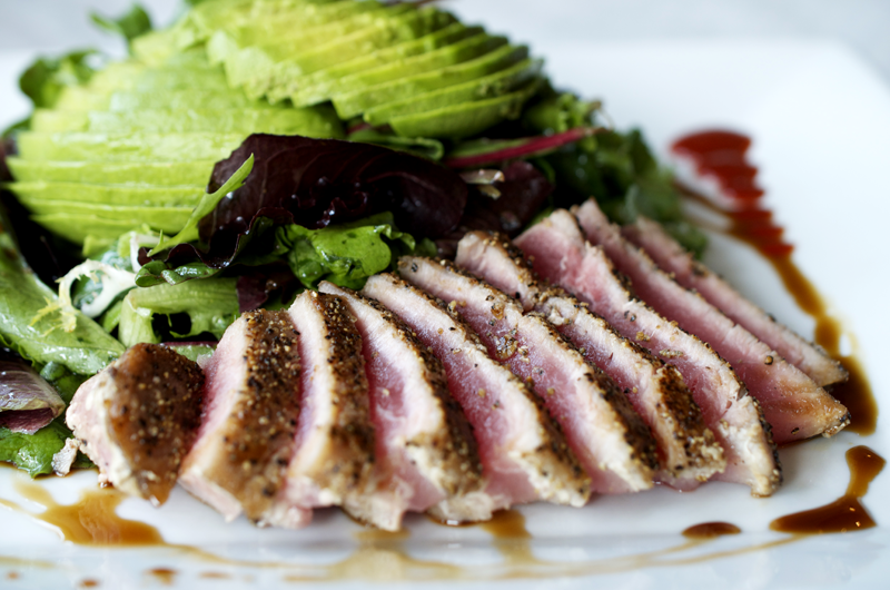 Ditch your boring lunch in favor of this light tossed salad topped with pan-seared ahi tuna, sesame ginger vinaigrette, sliced avocado and a citrus soy glaze. So. Good.