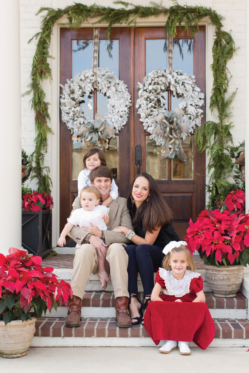 Page is resourceful and creative, opting to make almost everything that decorates her house with her own hands. During those early years of marriage, she pilfered her husband’s collection of deer antlers and found greenery and feathers to fill the tree and mantle. These days, the house overflows with gilded touches here and there, stuffed pheasants and shimmering ornaments. Her Radko collection has outgrown the 10-foot-tall tree so much that she has had to move on to a new collection: nativities. “I love to decorate for every holiday, but Christmas really takes the cake.” She begins decorating early and has as many as six trees throughout the house. Each child has a tree in their room with a unique theme. Hollins has a hot pink Candy Land-themed tree, while younger brother Skinner’s features shotgun shells and a plaid skirt: “A real traditional Southern boy theme.” There is a more casual tree in the family room covered with the kid’s art, and a tabletop tree in the foyer that has handprints in clay from all four of the children’s milestone ages.