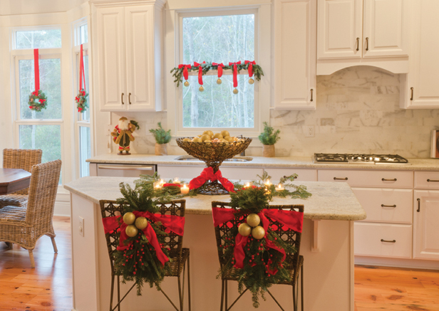 ABOVE Pops of red in the kitchen add high contrast against the room’s neutral color scheme. Tiny wreaths hang from the windows surrounding the breakfast area, while fresh garland with red ribbon and gold jingle bells drape the kitchen window. Christmas ferns, wrapped in burlap, freshen up the counter. The kitchen bar features a tall fruit bowl filled with gold ball ornaments. On the bar seats, bunches of fresh garland are hand tied with red berry twigs, crimson ribbon and gold ornaments.
