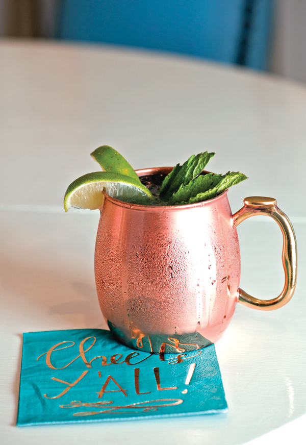 A Moscow mule is traditionally served in a copper mug. Melanie’s Southern-style version uses moonshine.