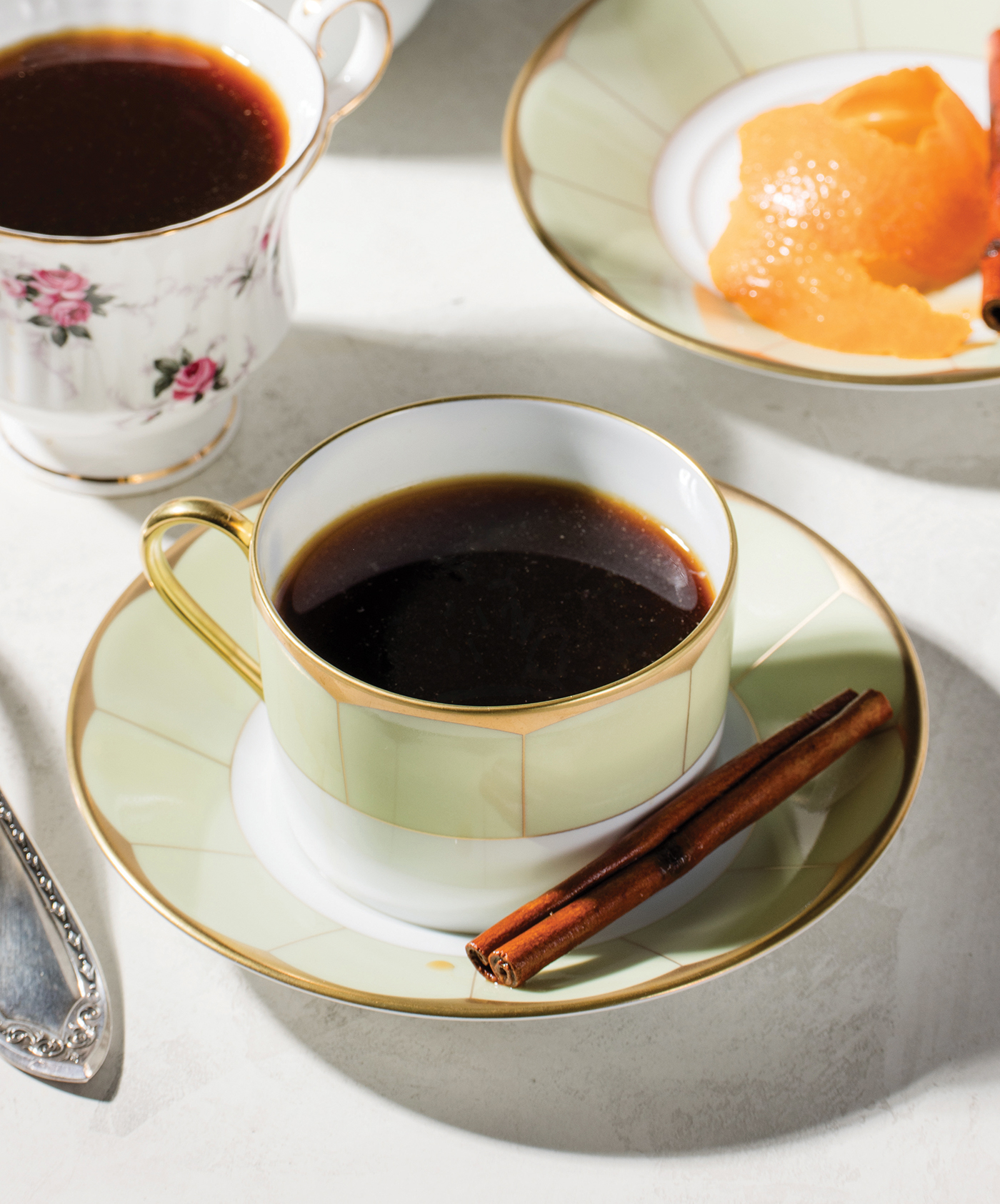 2. Turn off the heat. Using a stick lighter or long match, carefully set the mixture on fire. Let it burn for 30 seconds or more to singe the citrus peels and cinnamon, then pour the coffee into the pan to douse the flames. Stir well.