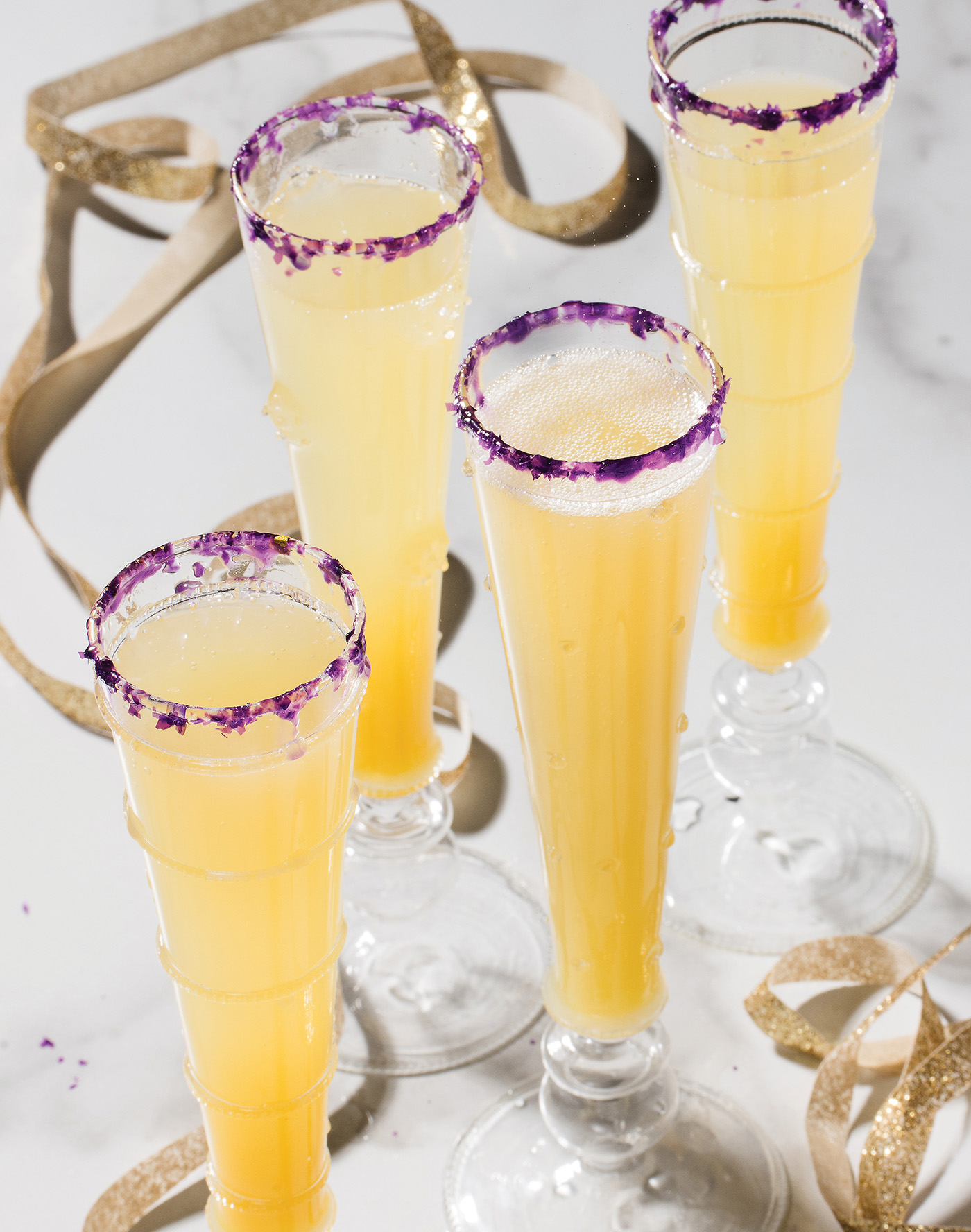 1. Place a tablespoon of water on a saucer and pour purple sanding sugar on another. Dip the rim of a champagne flute in the juice and then in the sugar. Set aside to dry.