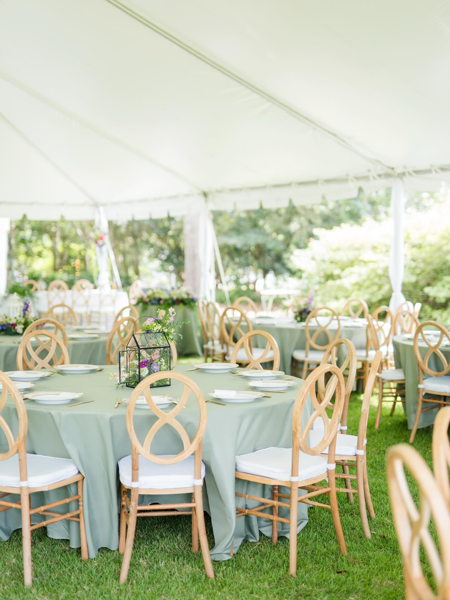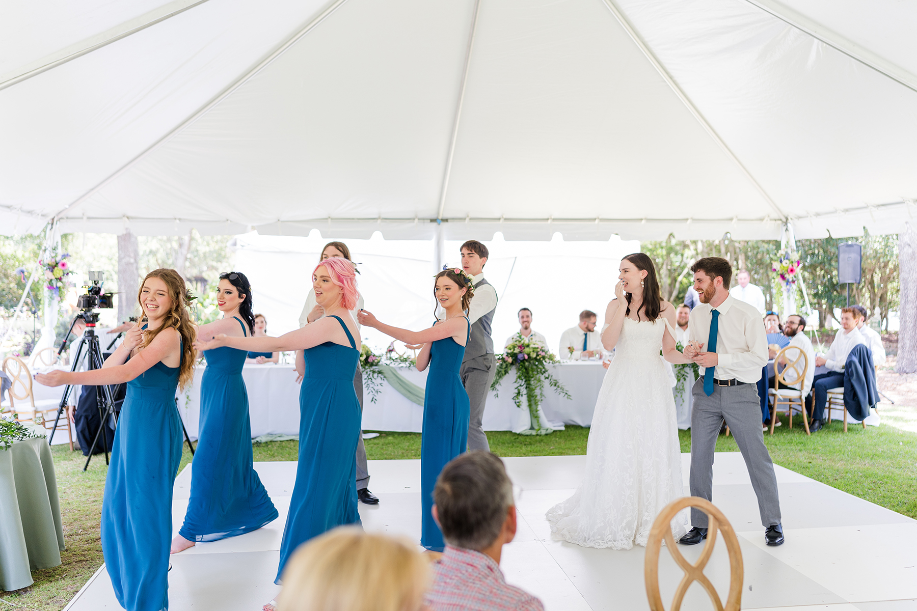 After the ceremony and photos, the couple joined the reception on the lawn. All enjoyed a brunch and mocktails, the couple’s first dance to Nat King Cole’s “L-O-V-E,” the mother and son dance, and the father and daughter dance. The bride’s cousins surprised everyone with a choreographed routine (based on an inside joke) and guests joined the dance floor. The festivities ended as all gathered at the Bellingrath dock, waving monogrammed handkerchiefs as the couple stepped onto our getaway boat and sailed away down Fowl River.