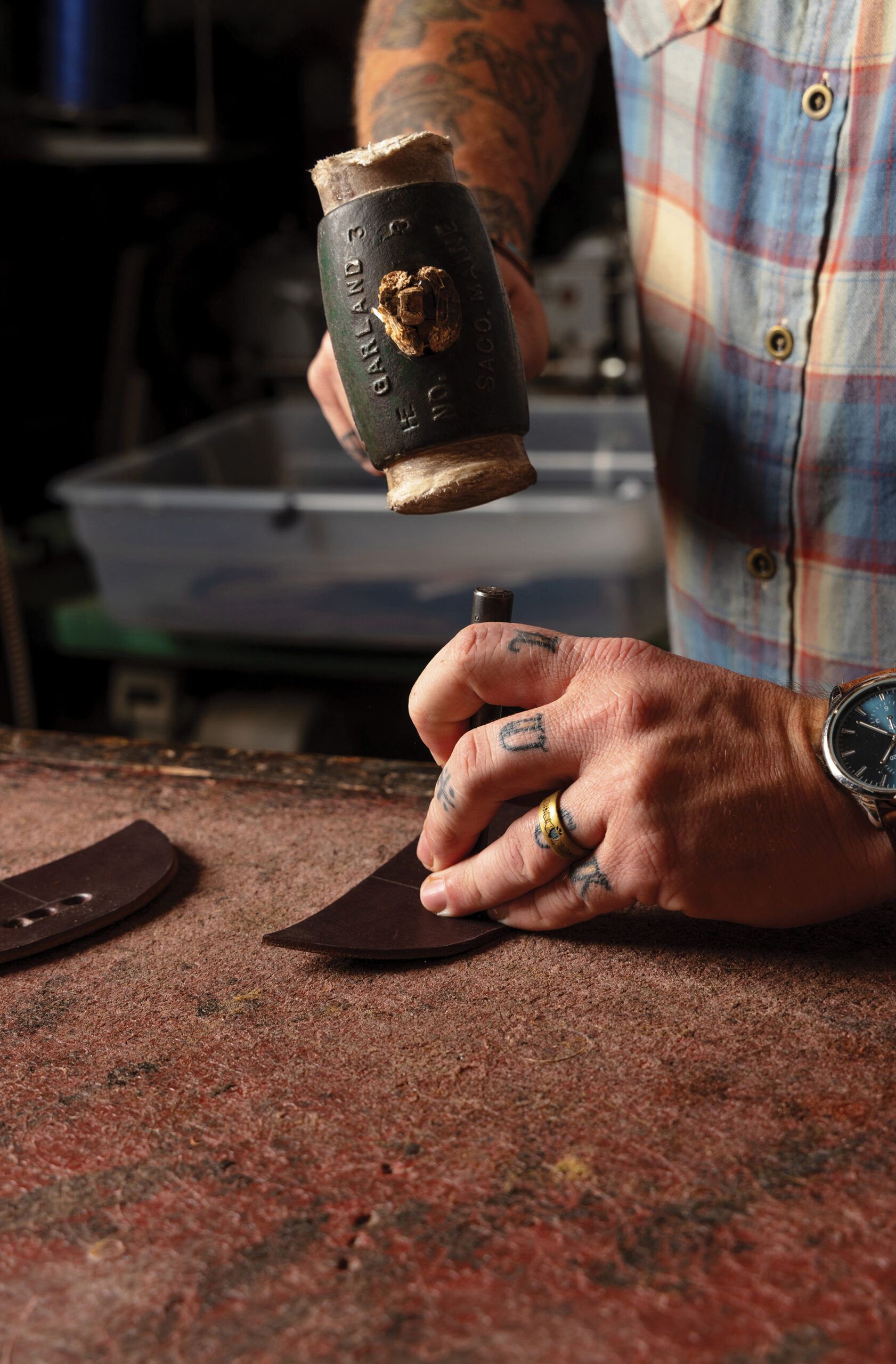 One day, he looked around the garage and realized a turning point had crept up on him: He had two months’ worth of work lined up around the room. He quit his other jobs and started working for himself full-time, and he never looked back. Now a master of his craft, he’s become a sought-after teacher, sharing his knowledge with other budding craftspeople who are eager to carry on the leatherworking tradition.