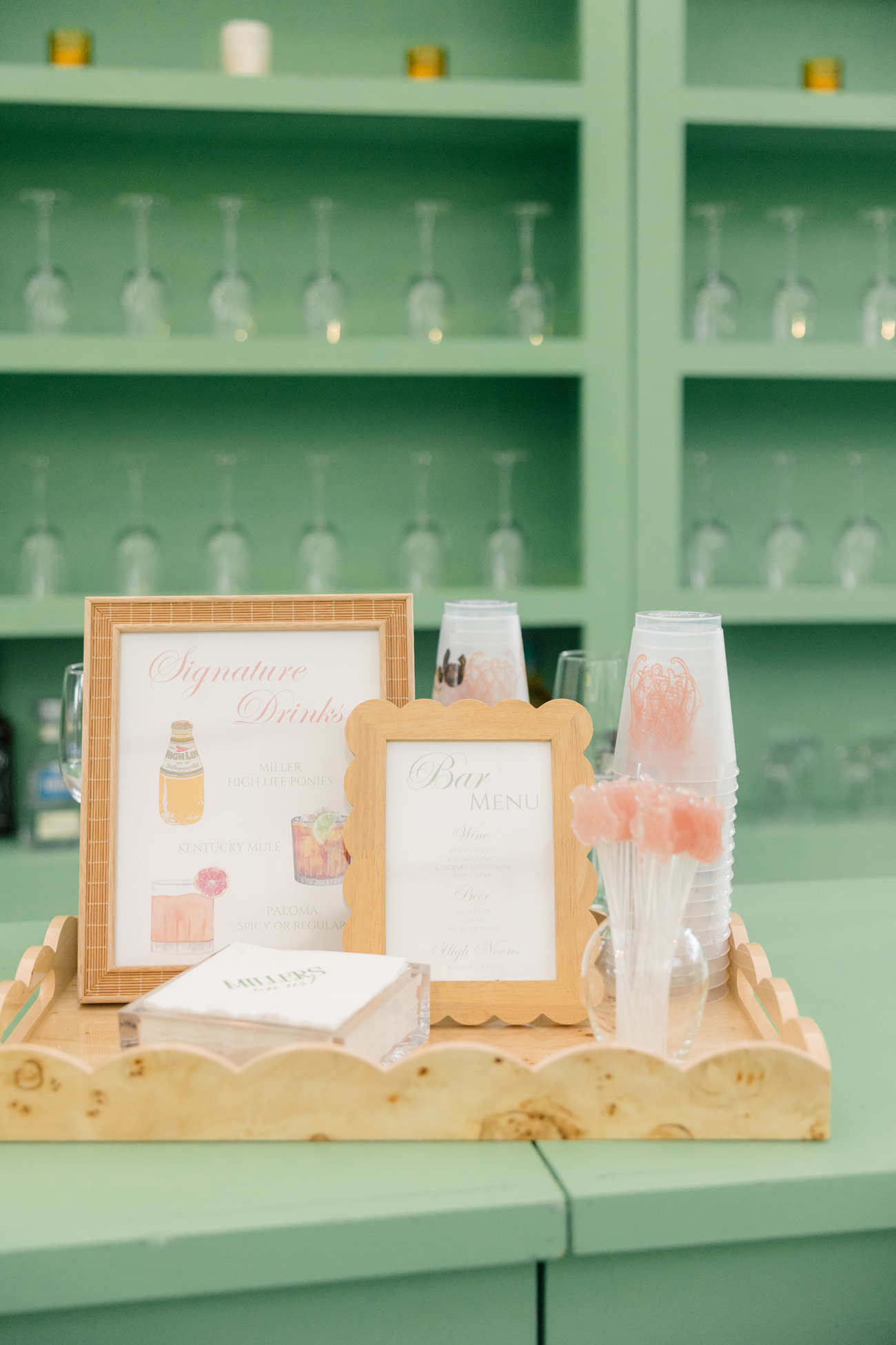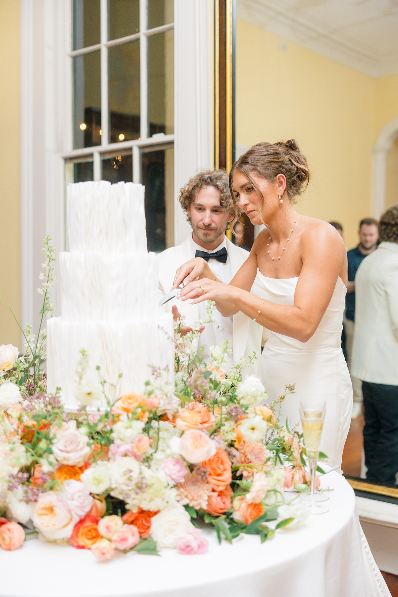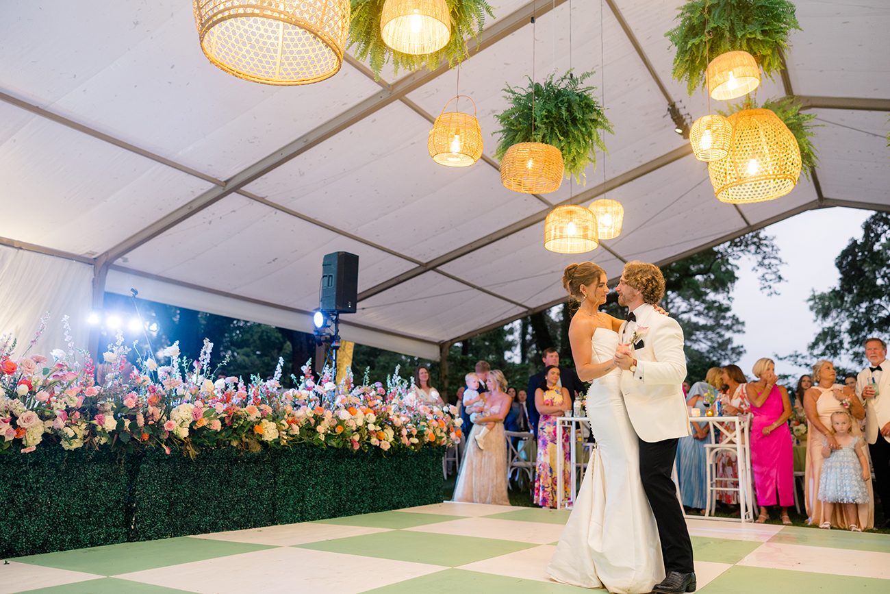 After the vows were said, the reception began. The bride’s intentionality was evident through the custom drink stirrers and matchbook covers and the softly textured cake design. However, the cherry on top came when, at the reception, she surprised her mother with a mother-daughter moment before the ceremony, captured on canvas by a live painter. Dancing, eating and celebrating continued as the sun set, and the evening eventually concluded with the couple’s exit.