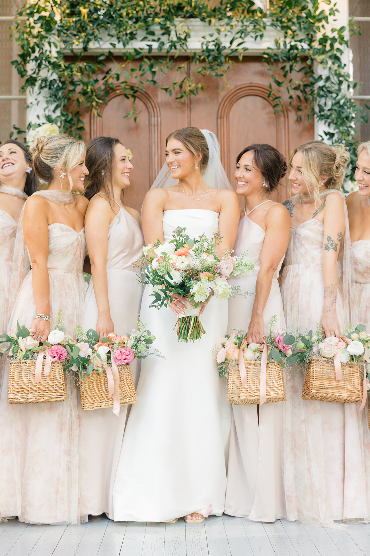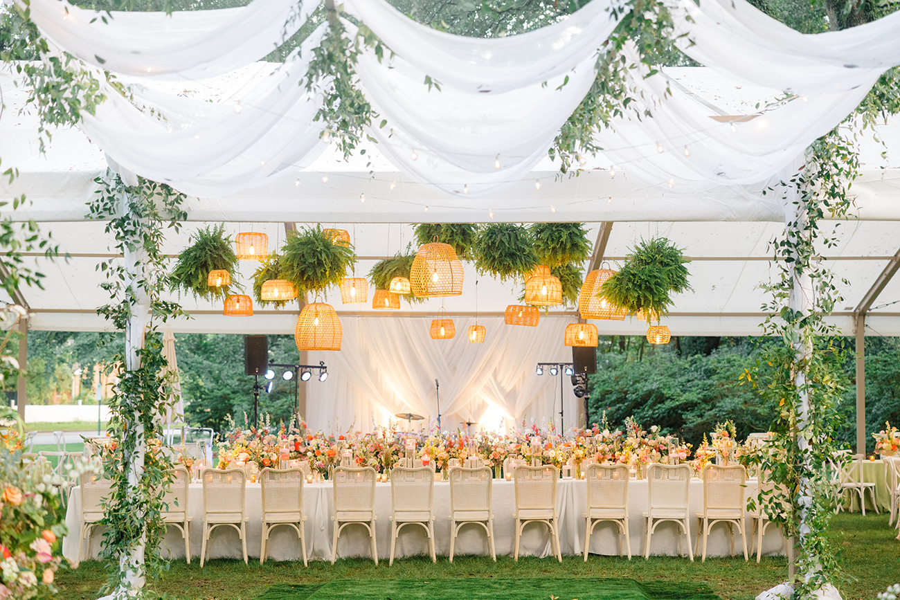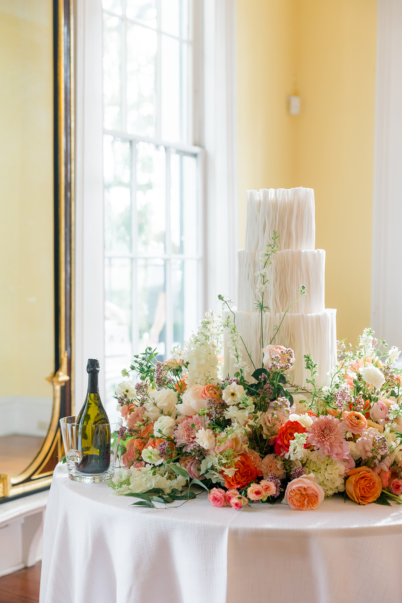 After the vows were said, the reception began. The bride’s intentionality was evident through the custom drink stirrers and matchbook covers and the softly textured cake design. However, the cherry on top came when, at the reception, she surprised her mother with a mother-daughter moment before the ceremony, captured on canvas by a live painter. Dancing, eating and celebrating continued as the sun set, and the evening eventually concluded with the couple’s exit.