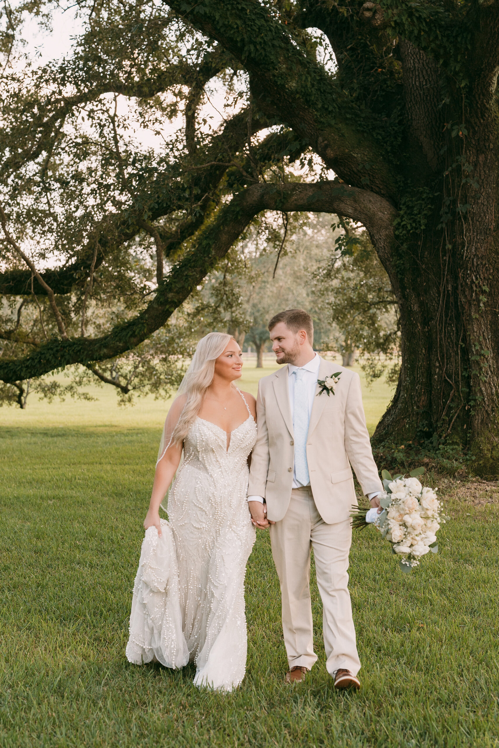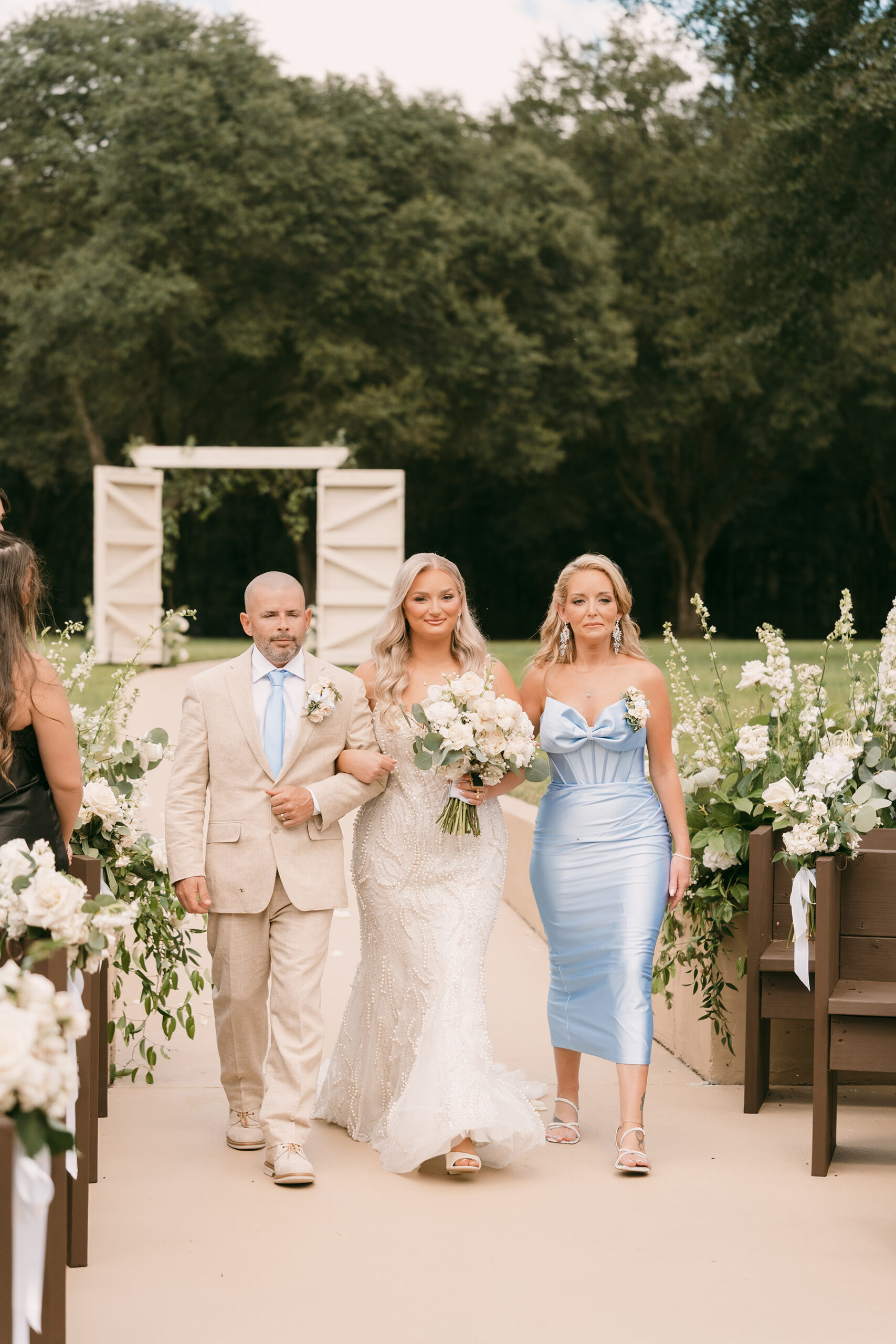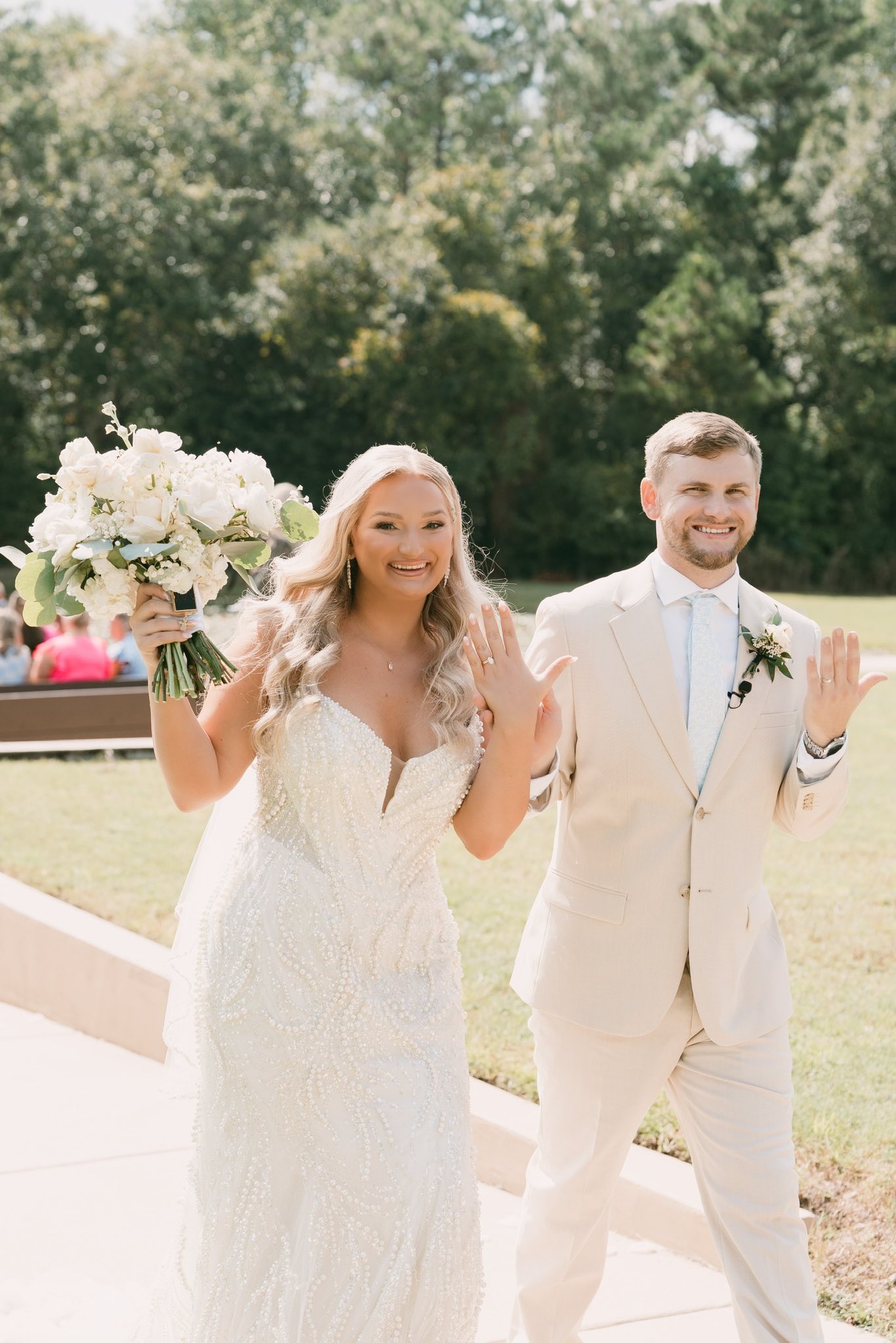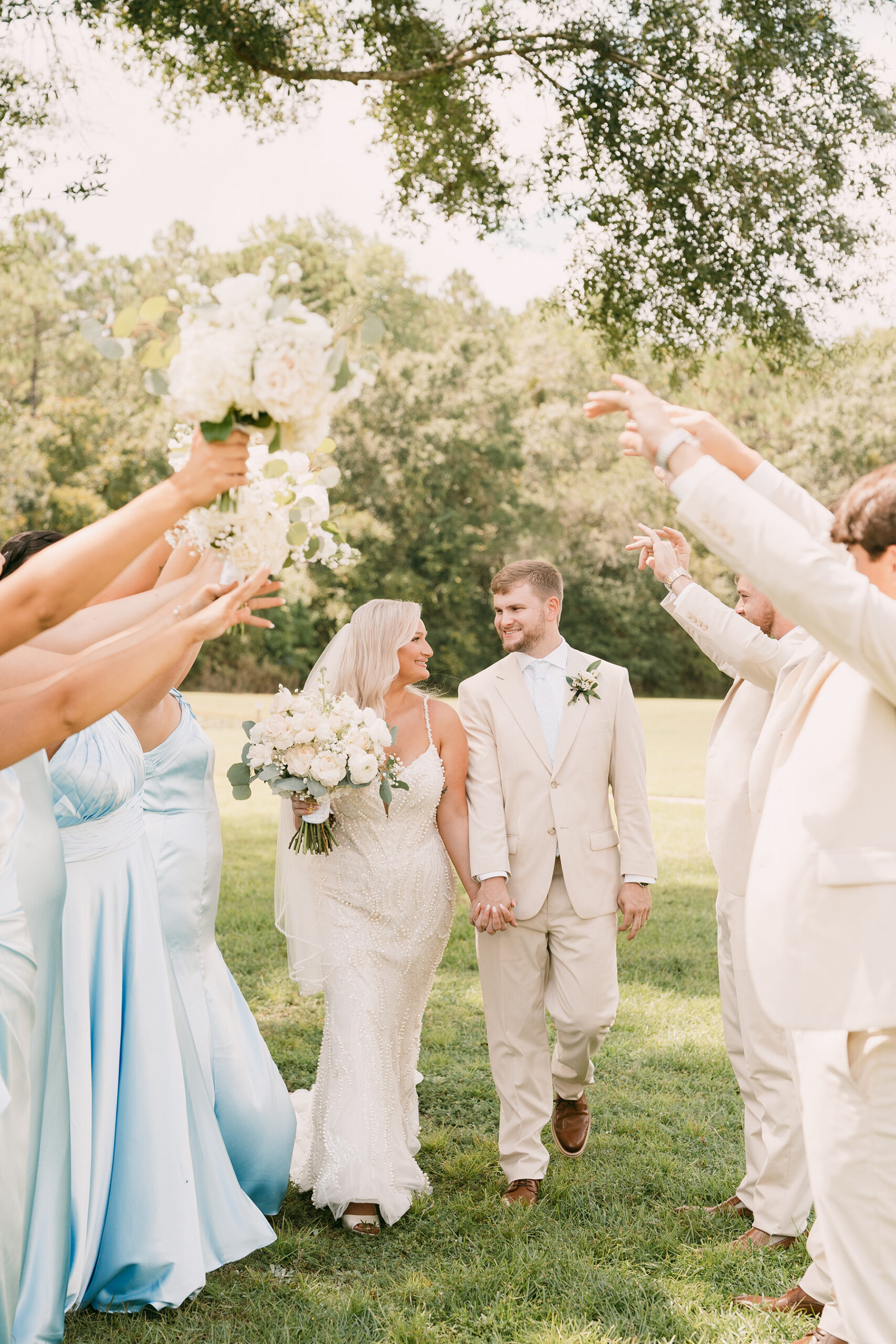The sun shone brightly at Hatcher Farms for Baige and Caleb’s picturesque wedding day in August. The couple met in 2020, and the bride planned the entire wedding from beginning to end, overseeing every detail with intention. The bridesmaids, arrayed in blue, processed down the aisle, followed by the bride, donning a beaded wedding gown and arm in arm with her mother and stepfather. Heartfelt vows preceded the couple being announced as husband and wife. The newlyweds walked back down the aisle to applause from their guests, which the bride describes as a feeling like no other.