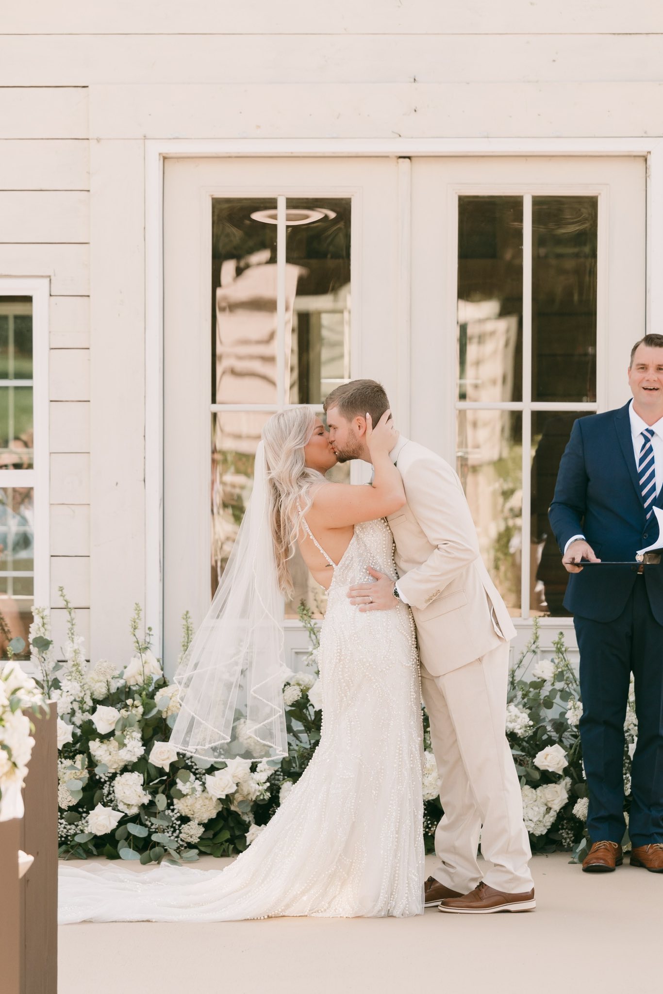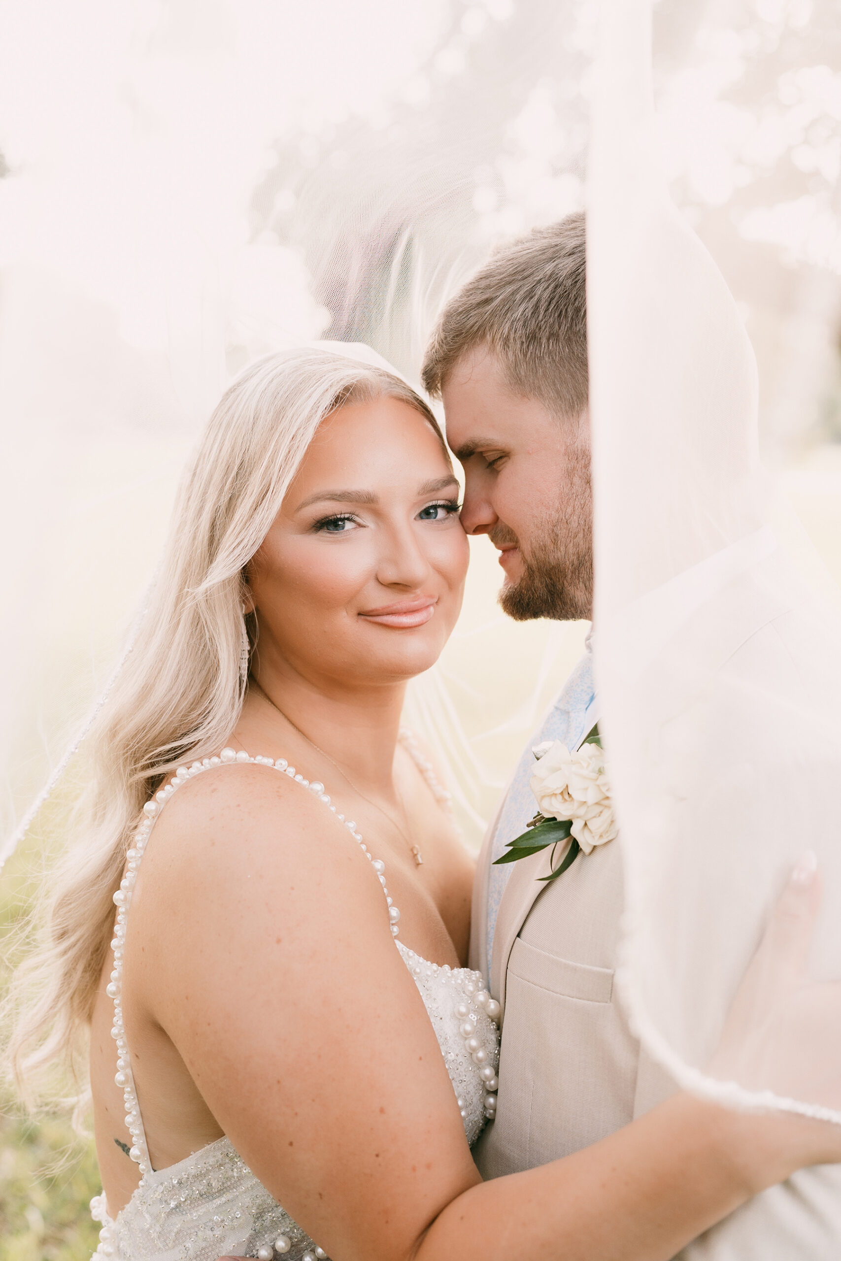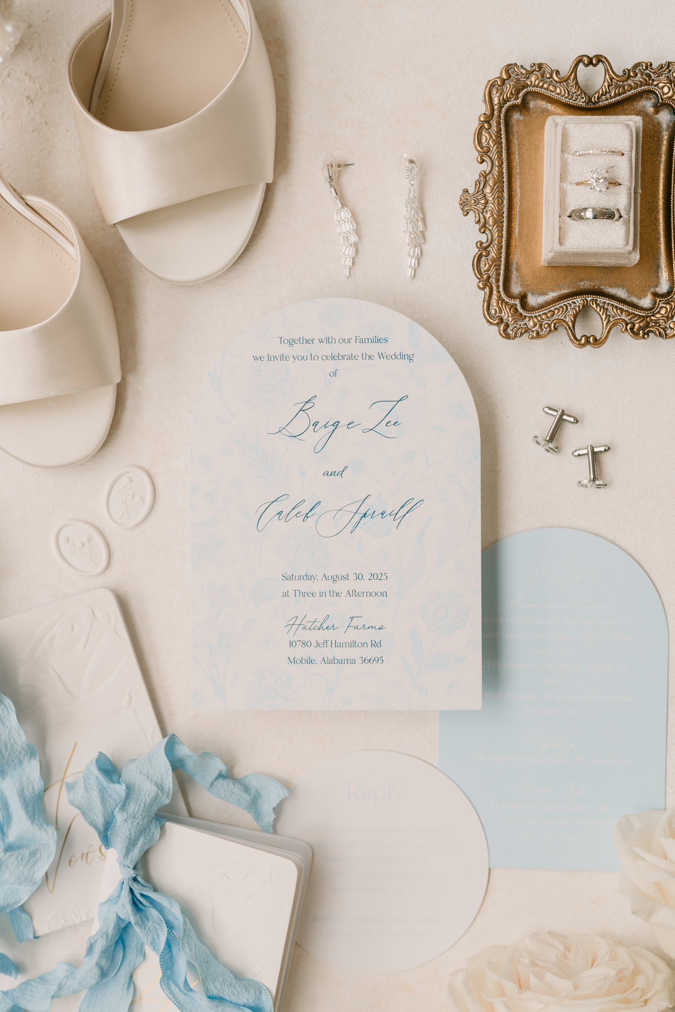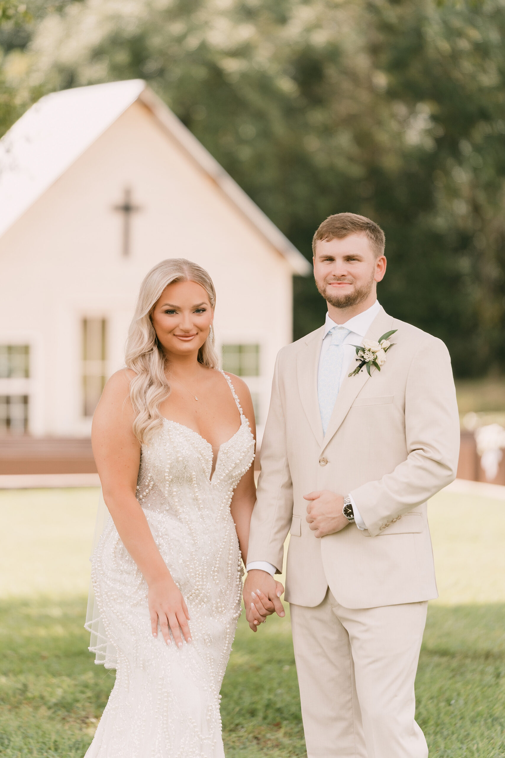 The sun shone brightly at Hatcher Farms for Baige and Caleb’s picturesque wedding day in August. The couple met in 2020, and the bride planned the entire wedding from beginning to end, overseeing every detail with intention. The bridesmaids, arrayed in blue, processed down the aisle, followed by the bride, donning a beaded wedding gown and arm in arm with her mother and stepfather. Heartfelt vows preceded the couple being announced as husband and wife. The newlyweds walked back down the aisle to applause from their guests, which the bride describes as a feeling like no other.