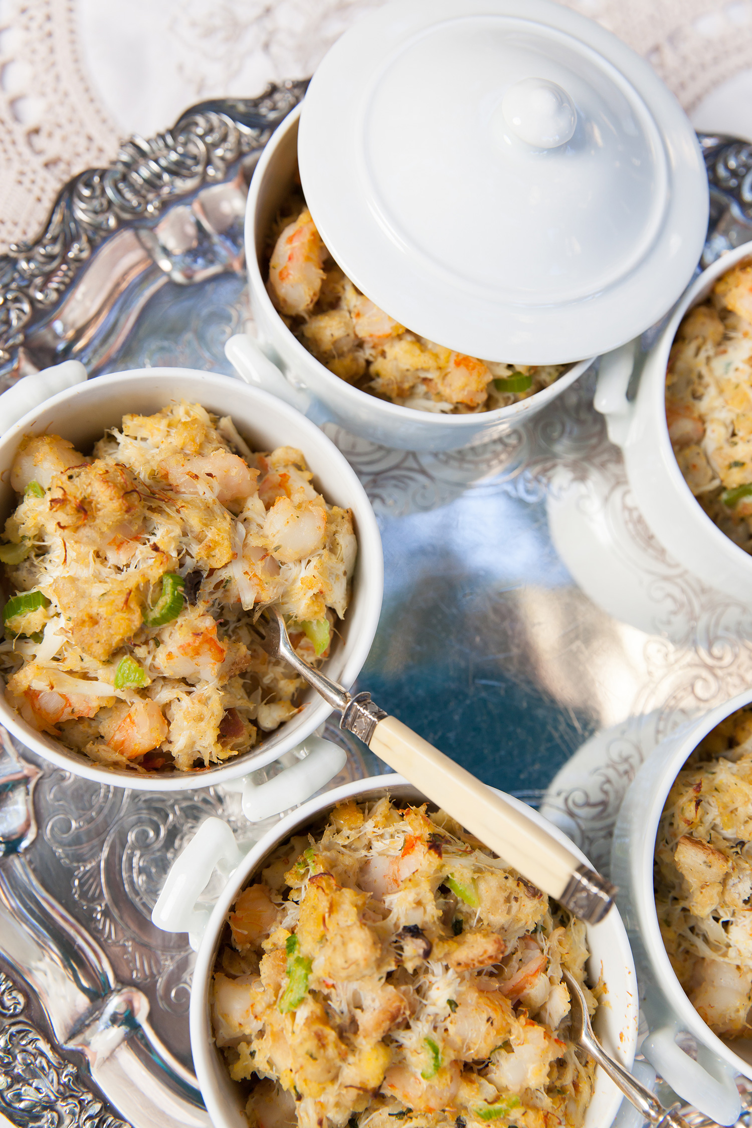 This warm, savory seafood stuffing makes a glorious entrée or side dish. Charles and Greg like to serve it in individual ramekins as a filling, pick-up party food.