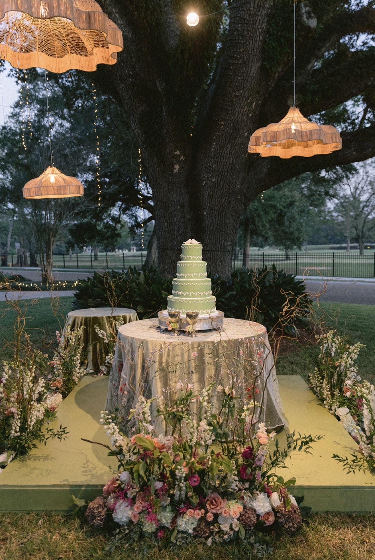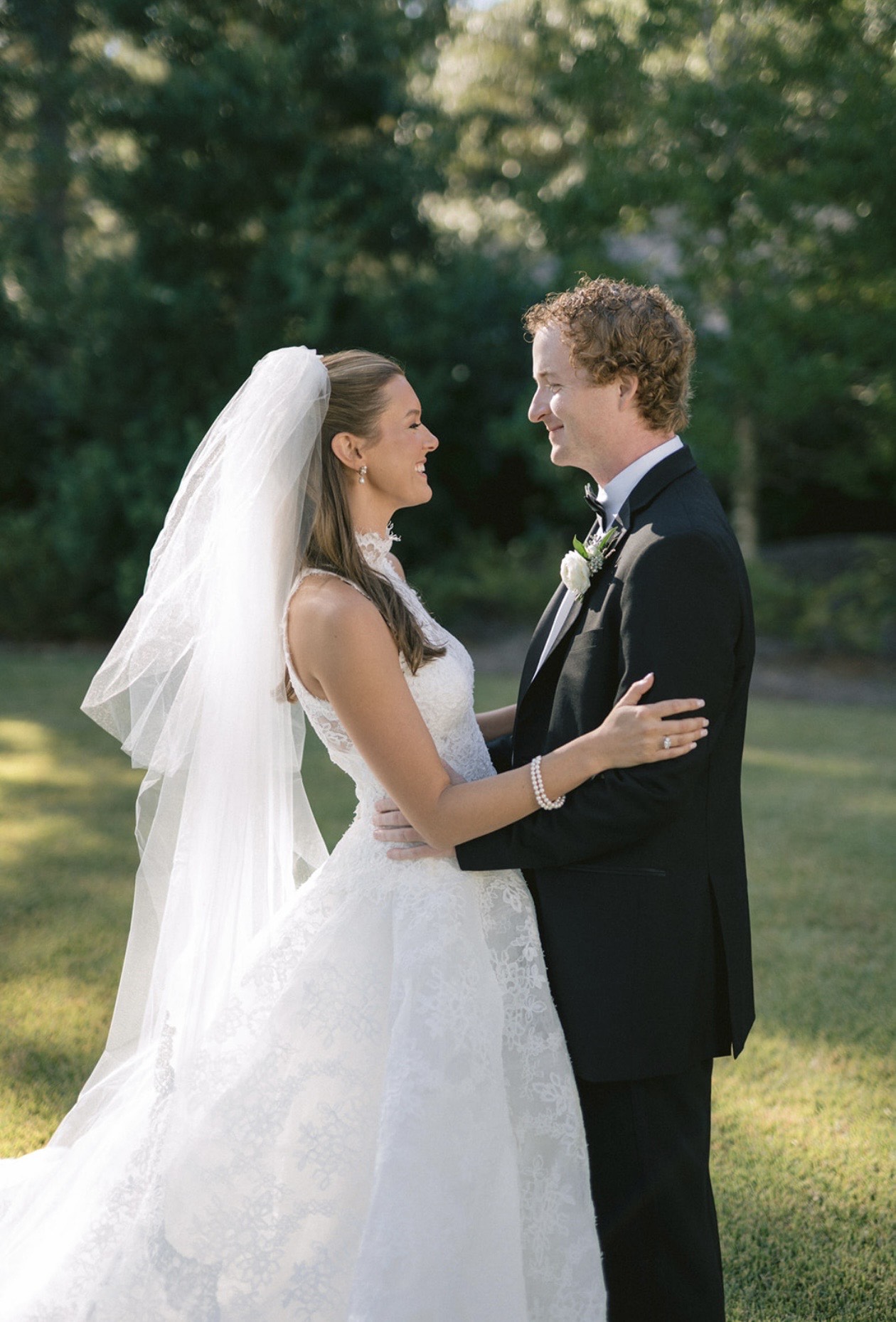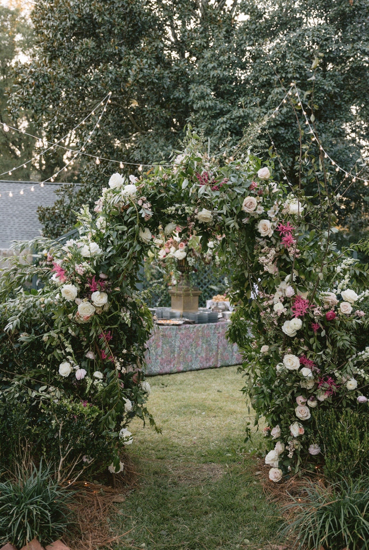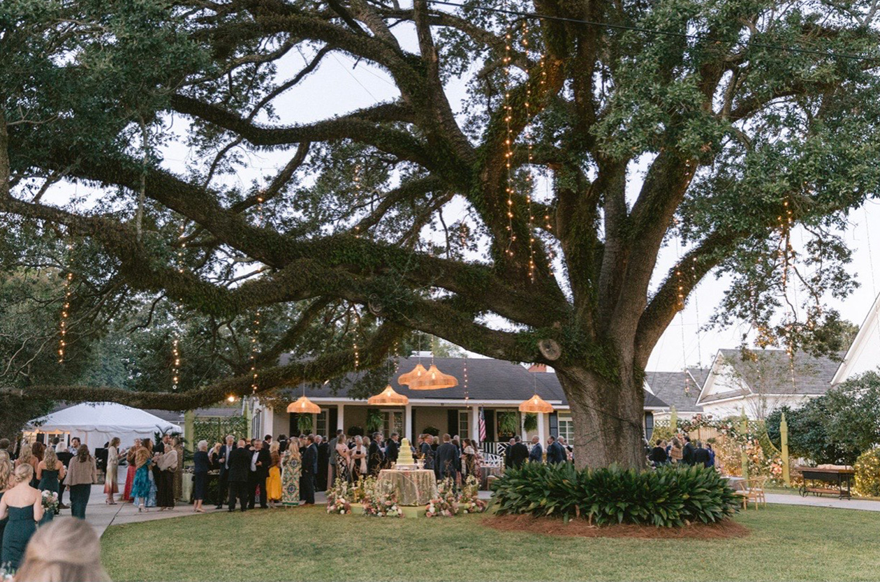Afterward, all gathered at the reception at the home of the bride’s parents, just three houses down from the home of the groom’s parents. The backyard was transformed into an enchanting setting for the garden party reception, complete with intricate florals and string lights. Guests entered under the lattice entrance to the backyard, where food and drink were served. After cutting their four-tier wedding cake and dancing for hours with their guests, the newlyweds exited the celebration, embarking on their new life as husband and wife.