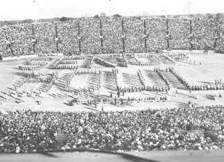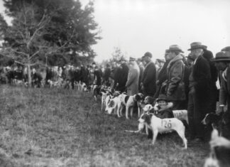 Retrieve the history of the Foy Field Dog Trial with a photo of a 1920s starting lineup.