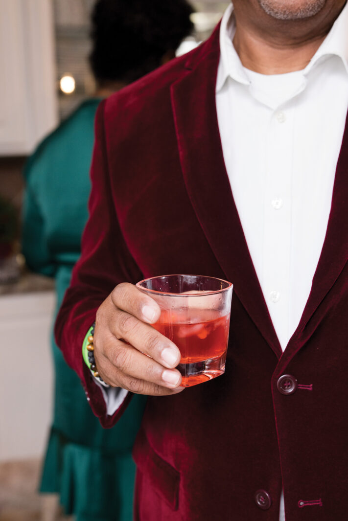 The couple’s glittering Christmas decorations are complemented by poinsettias and fresh florals from Rose Bud Flowers, and gregarious guest Eric Finley plays the part of Santa Claus. “He basically antagonizes everybody,” said Cassandra with a laugh.