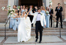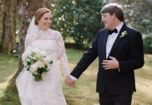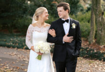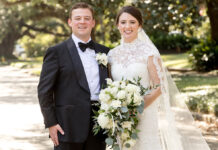 Claire and Keenan’s winter wedding was nothing short of enchanting. The bride, groom and wedding party got ready at the Battle House Hotel, arriving at the church by trolley for the ceremony. At the reception, the bride and groom had their first dance to “At Last” by Etta James. Guests, decked out in Mardi Gras masks, celebrated on the dance floor. The day held an additional celebration as participants sang happy birthday, ate cake and passed out cigars for the father of the bride’s 80th birthday.