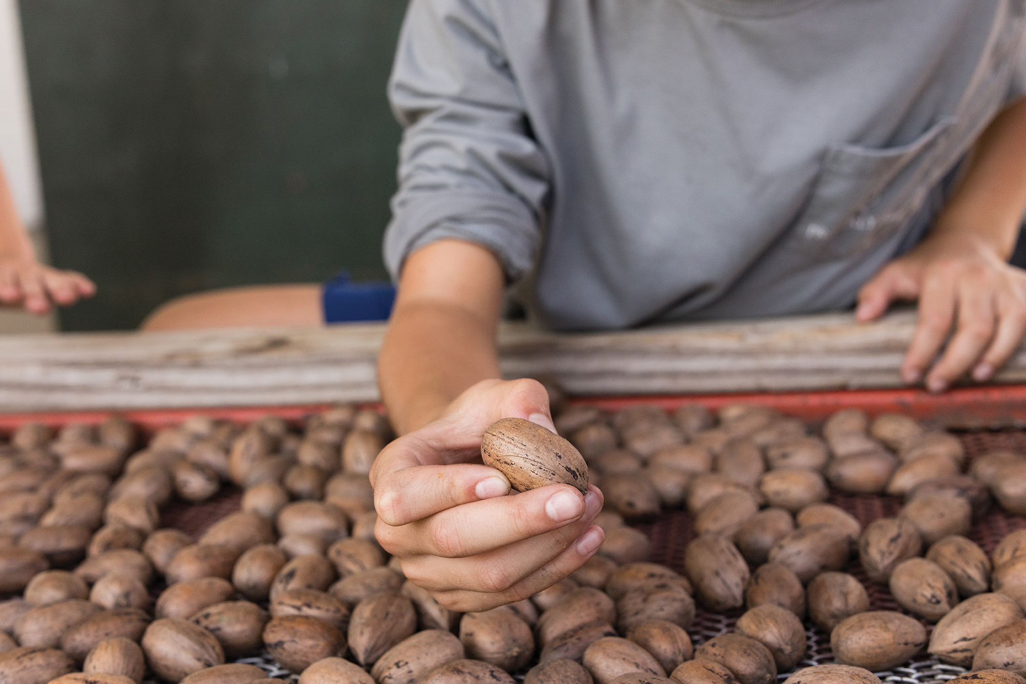 After the harvest comes grading, the staple chore of Kyle’s childhood and a time-sensitive process that requires all hands on deck. “When you’re picking pecans off the ground, they have to get graded within a day or two or they start to go bad,” says Sarah.