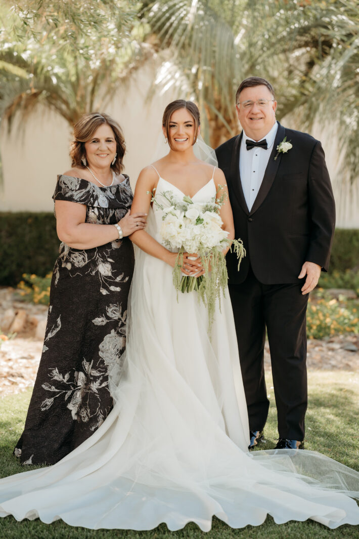 Julianne and Jeremiah enjoyed a wedding weekend in the place where their relationship first began. The native Mobilian bride moved to Las Vegas in 2020, where she then met her groom, and family and friends traveled from across the United States to celebrate the nuptials. The evening ceremony took place on a golf course, with the bride carrying a bouquet wrapped in materials from her maternal grandmother’s wedding dress and lace from her mother’s wedding dress, with her paternal grandmother’s wedding band attached. The couple exchanged personal vows and took communion together during the ceremony, after which the guests went on to the cocktail hour.
