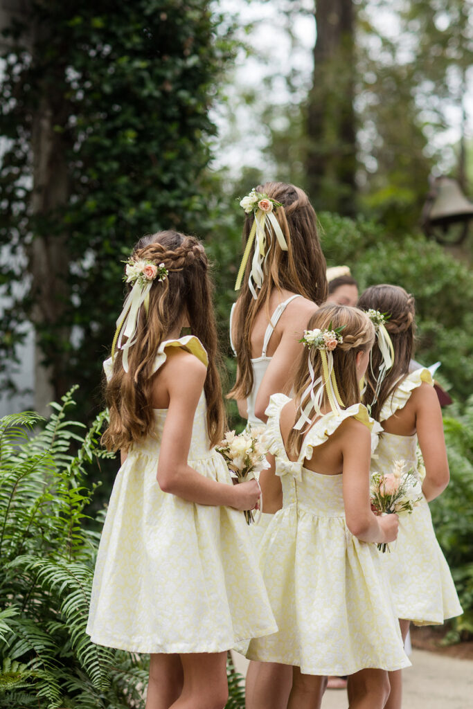 A blended family is a beautiful gift, as is bestowing the honor of serving as bridesmaids and groomsmen to your children. Joey’s twin girls, Keely and Bailey, 10, were adorable in soft yellow dresses (by Janie and Jack), and Wyatt, 13, and Owen, 14, looked dapper in suits (by Metzger’s).