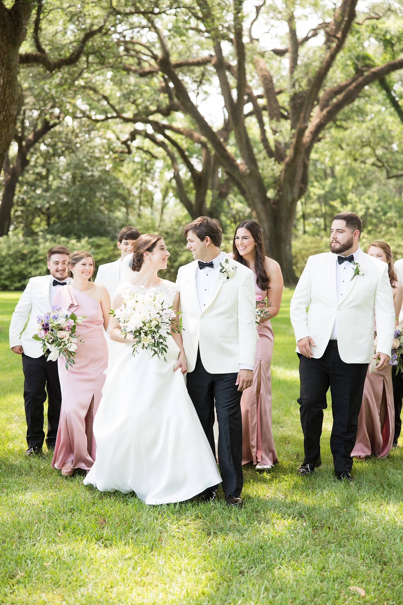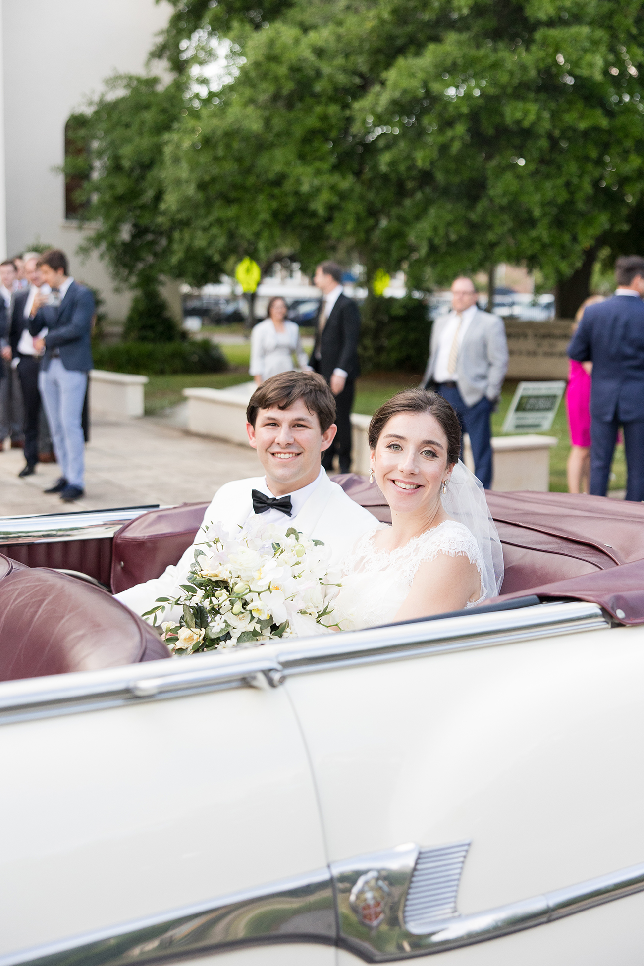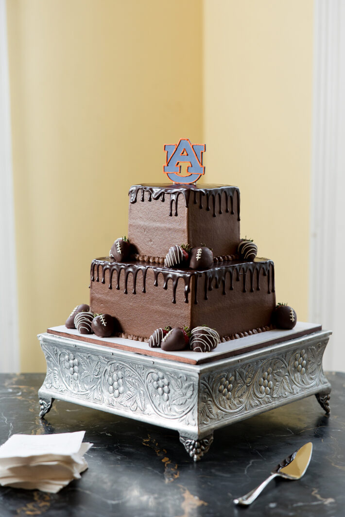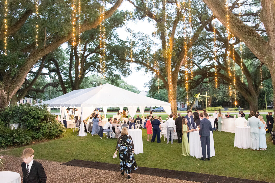 Afterward, guests gathered under tents at Bragg-Mitchell Mansion for the reception. String lights glowed amongst branches of the oak trees as the newlyweds shared their first dance and the dance floor opened to guests. Night fell as the party continued, eventually coming to a close as the couple exited through white shakers and drove off in a 1953 Packard.