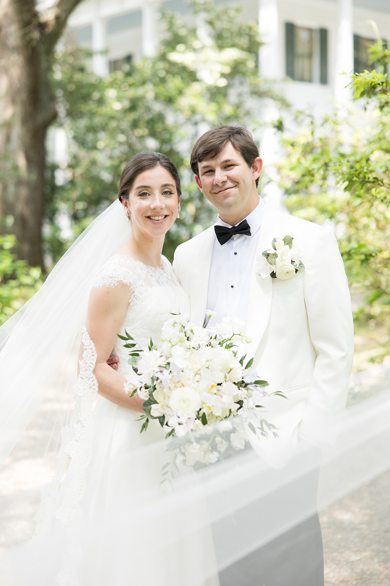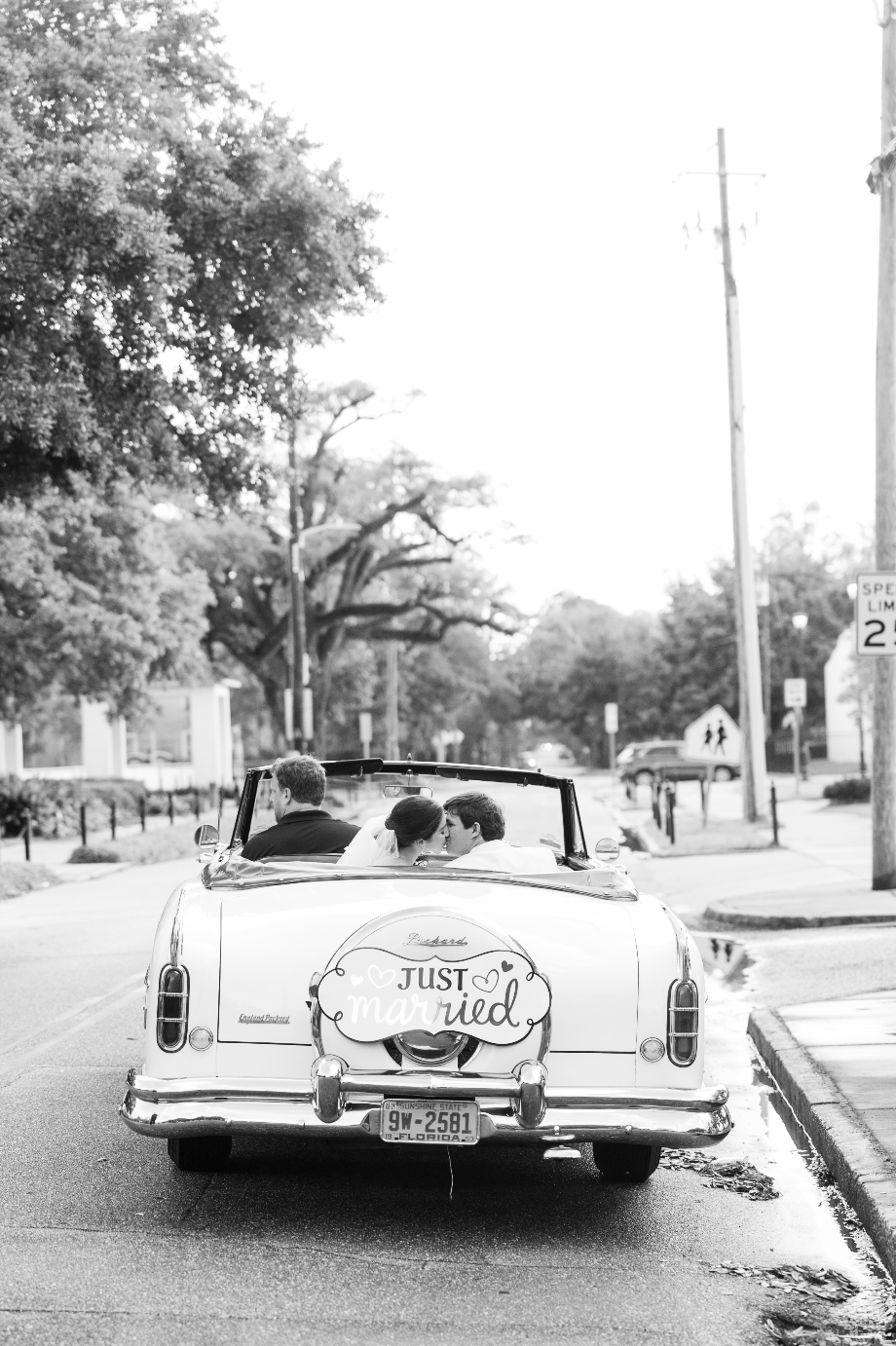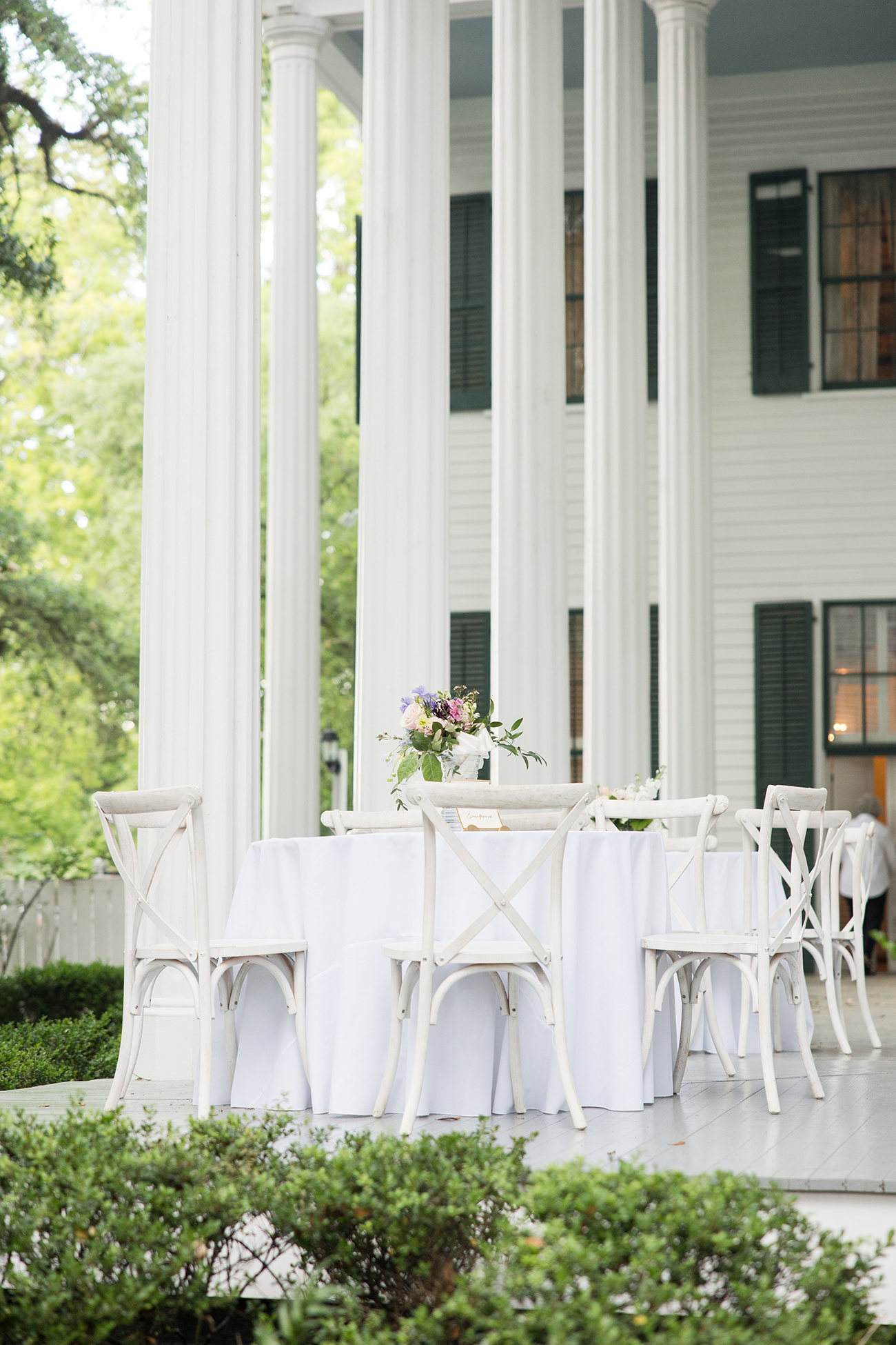 Afterward, guests gathered under tents at Bragg-Mitchell Mansion for the reception. String lights glowed amongst branches of the oak trees as the newlyweds shared their first dance and the dance floor opened to guests. Night fell as the party continued, eventually coming to a close as the couple exited through white shakers and drove off in a 1953 Packard.