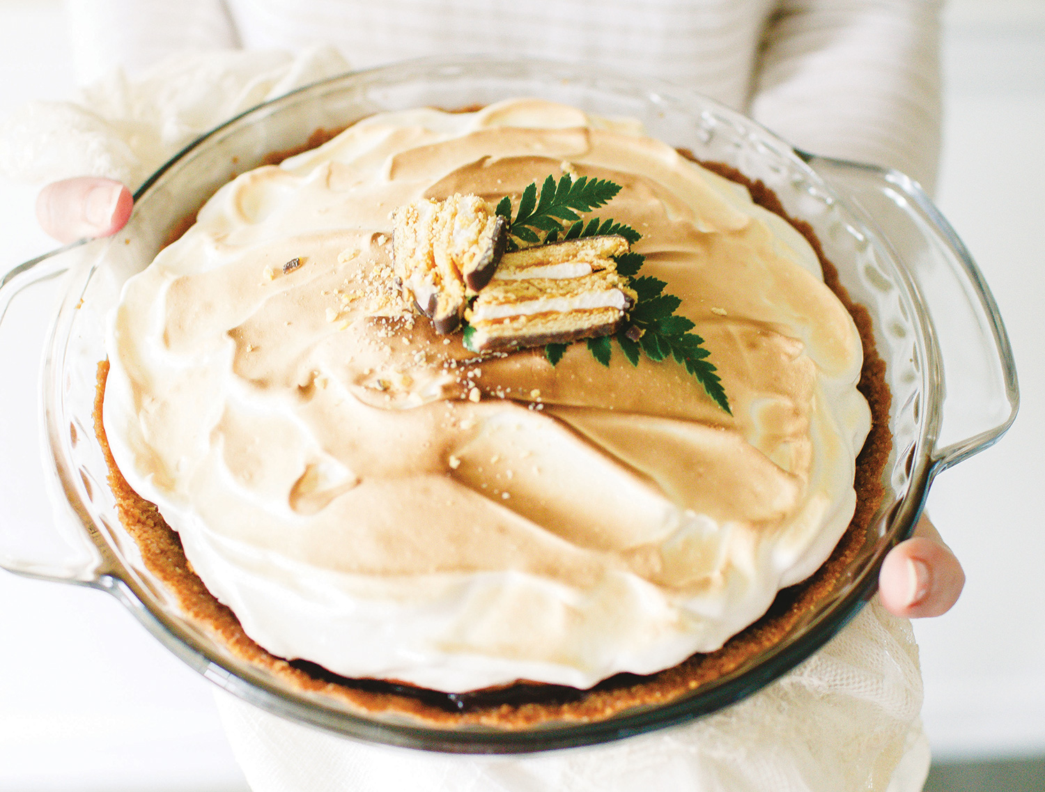 11. Pour meringue on top of the pie and spread it out evenly. Set the pie on a baking sheet and toast under an oven broiler for 20 – 30 seconds. Once the meringue is slightly toasted, remove pie from oven and allow to cool slightly. Garnish with MoonPie, if desired.