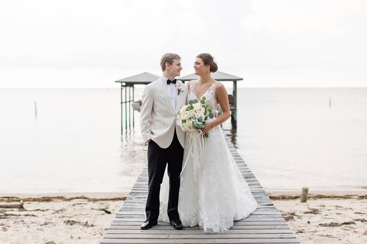 When Margaret looks back on her wedding day, she says she wouldn’t change a single thing. Many friends and family members traveled to Point Clear for the couple’s evening ceremony by the Bay. A cloudy overcast sky alleviated the Gulf Coast heat typically accompanying June weddings, making way for an enjoyable outdoor reception. Guests happily took to the dance floor and enjoyed food, drinks and wedding cake. Celebrating continued well into the night before the couple made their getaway through a cascade of flower petals.