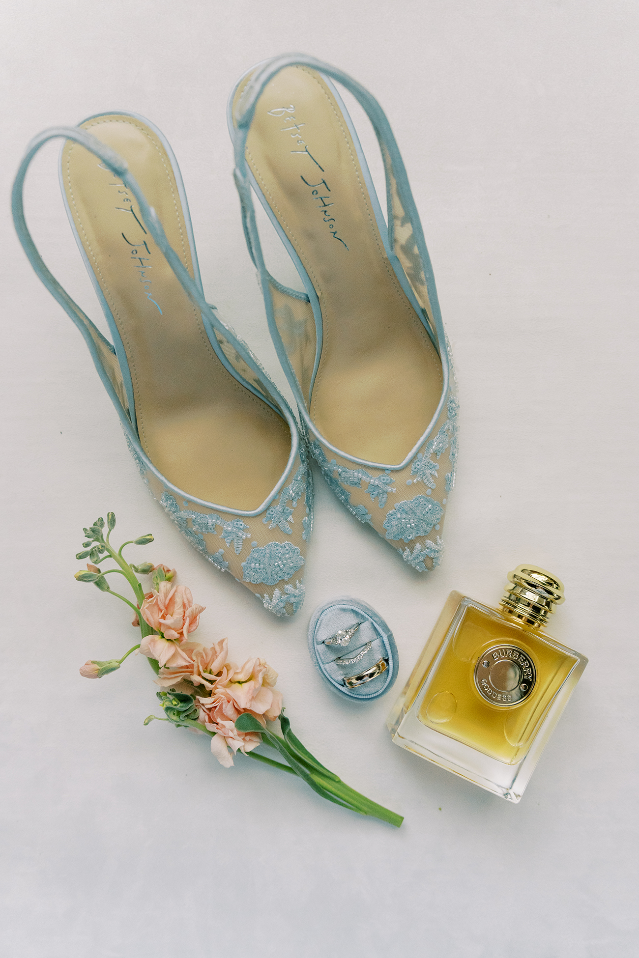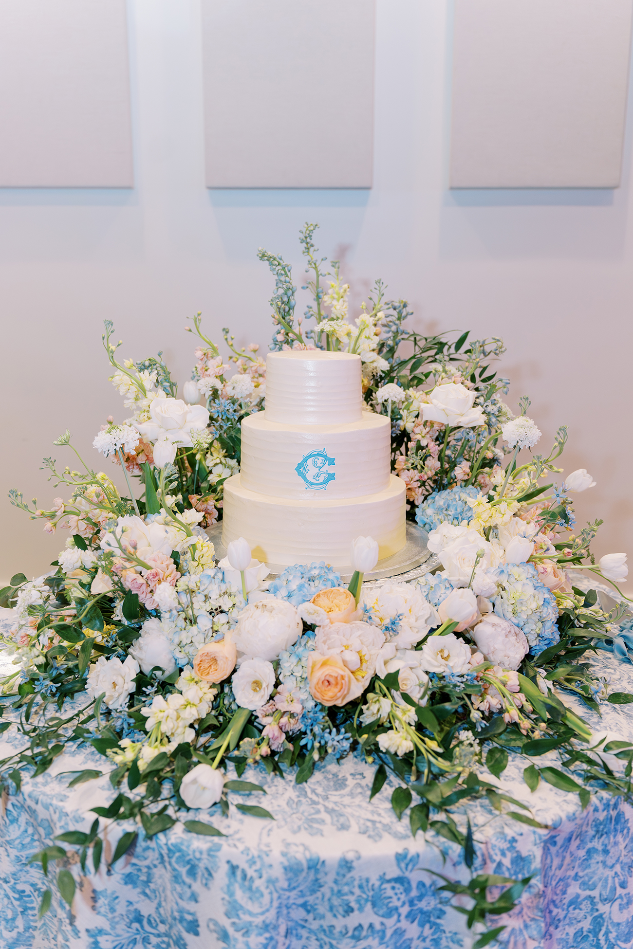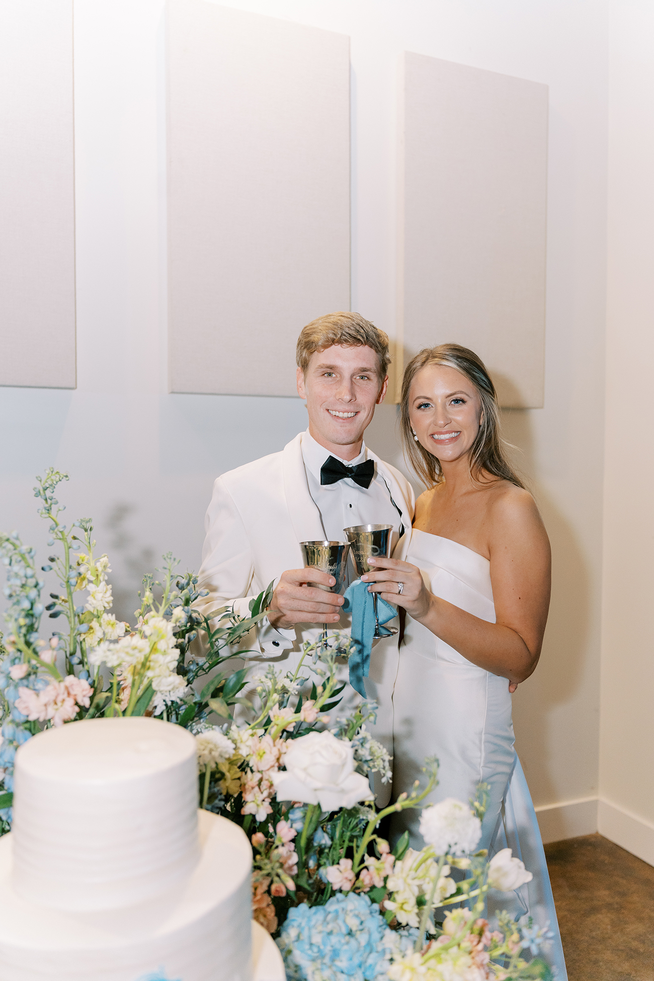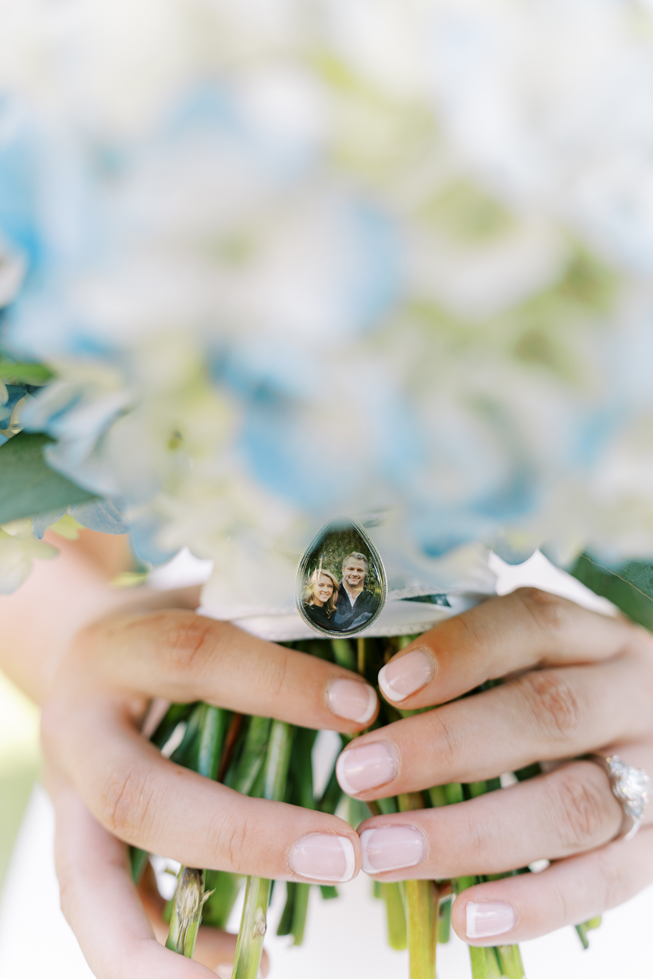 Family and friends gathered for the ceremony, with soft blues, greens and pinks complementing the venue. The bride processed down the aisle accompanied by her mother and brother; her bouquet bore a charm in loving remembrance of her deceased father. The couple’s custom vows added a personal touch to the ceremony, and their first kiss as husband and wife, the reception began.