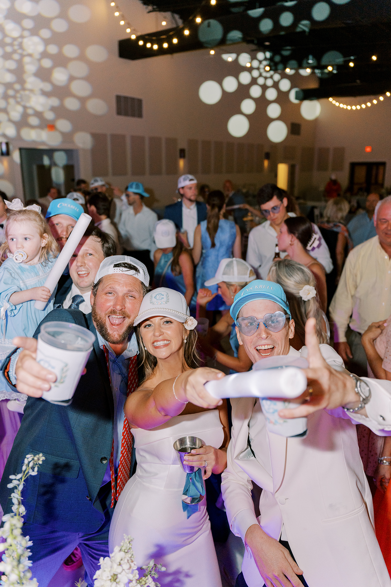 A Motown jazz band kept everyone on the dance floor, donning hats and huggers with the newlywed’s crest. After several hours, the couple made their exit through a tunnel of sparklers.