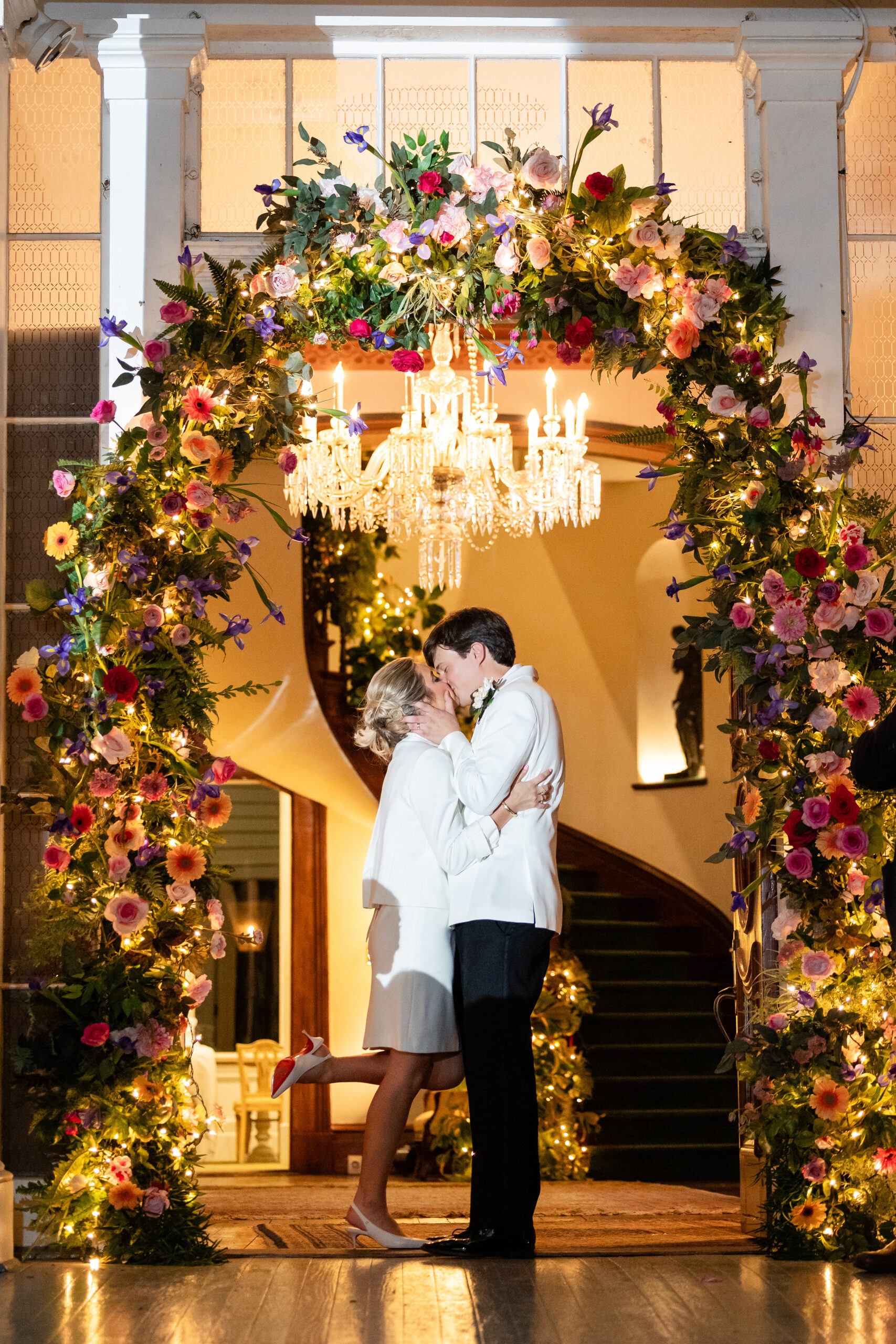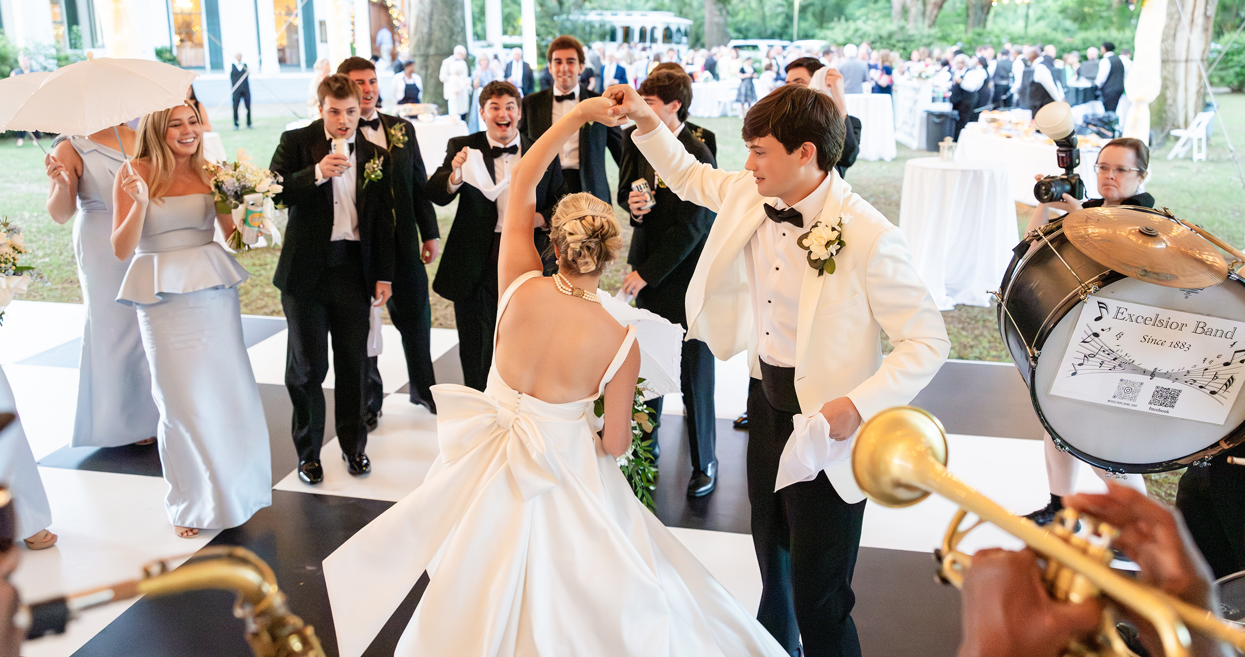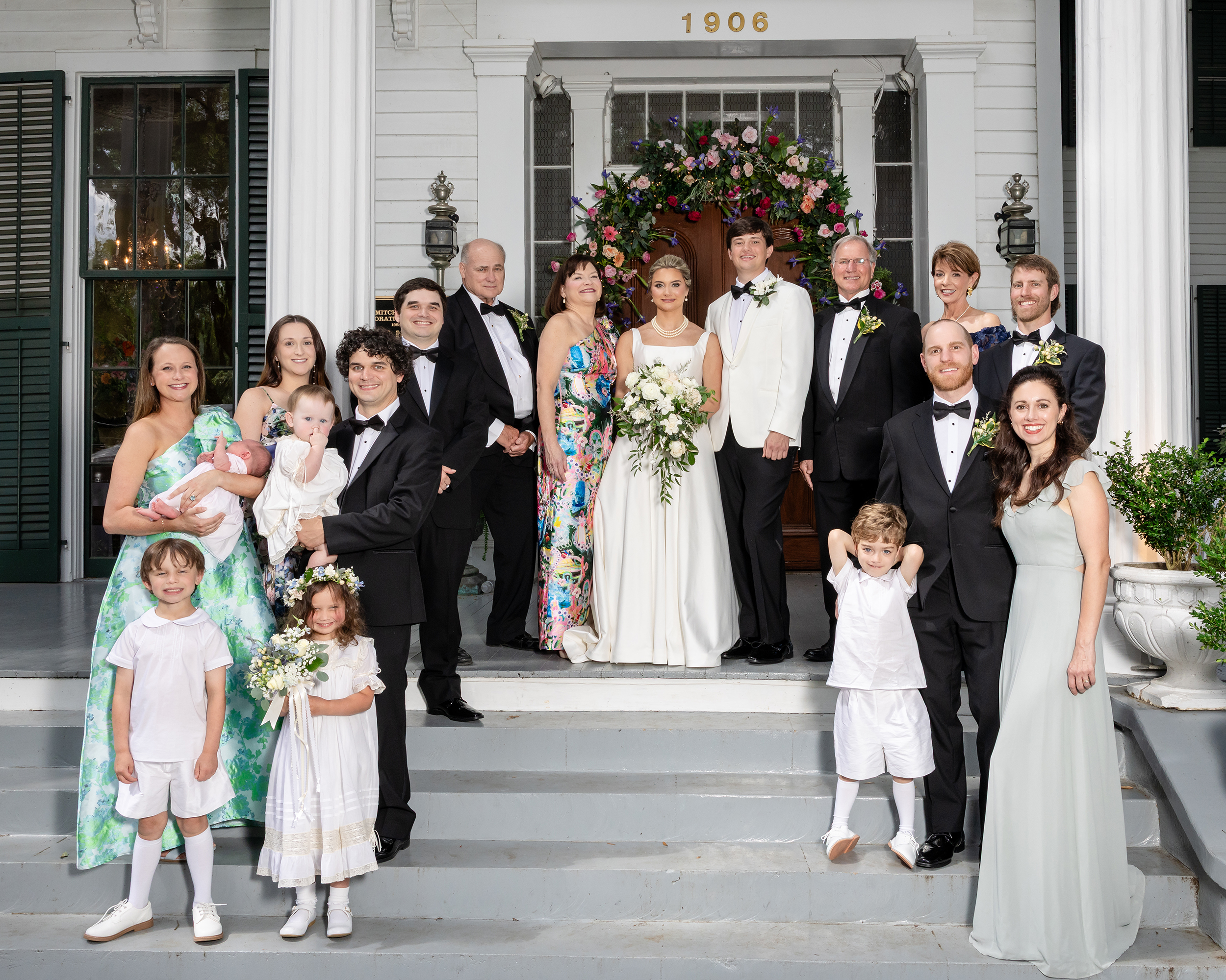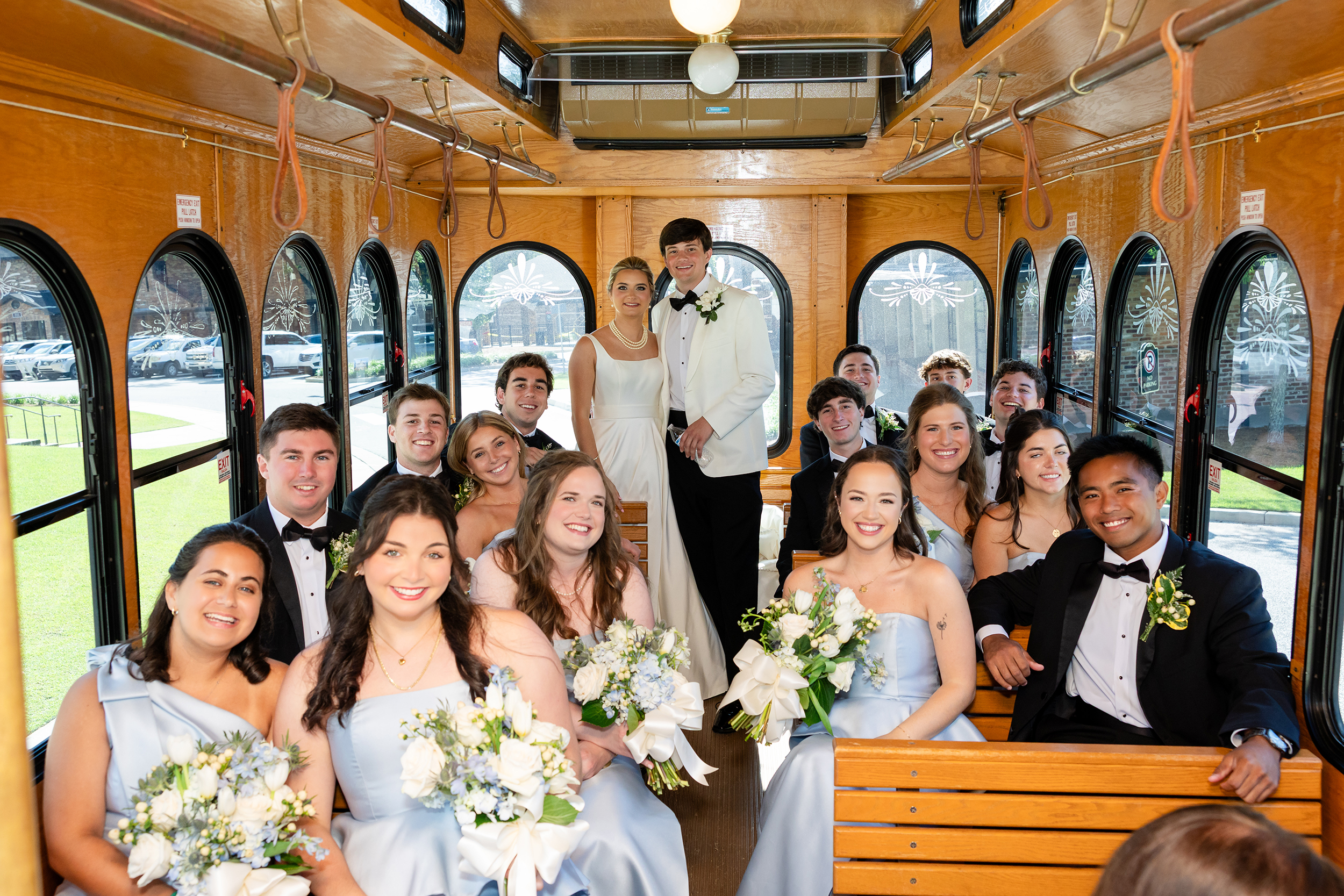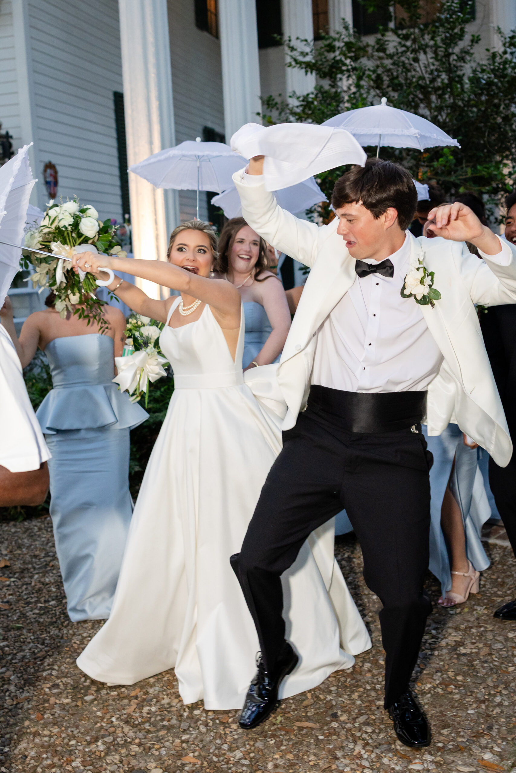 After a trolley ride to Bragg-Mitchell Mansion, the party was greeted by a surprise Excelsior Band second line (courtesy of the bride’s grandmother). The bridal party waved parasols and handkerchiefs as they accompanied the bride and groom into the reception. The evening continued with music from the Fuego Band, dinner and dancing, with the newlyweds sharing a private meal upstairs, thoughtfully prepared by Clifton Morrisette to accommodate the bride’s celiac disease. The night concluded with a rose-petal send-off, with the bride donning a going away outfit that formerly belonged to her mother.