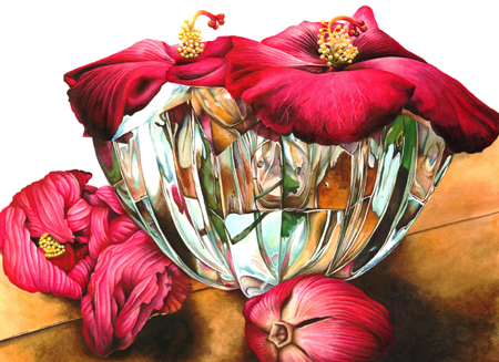 So then, why change media? “Every once in a while you really need to shake yourself up a little. I’m so wedded to the way I work, the way I think, that it’s really hard for me to do that, ” she responds. “In school, one of my instructors, Linda Schele, tried to turn me to abstract expressionism. It didn’t stick. Still, I got a lot of insight from the experiment. It allowed me to think about the abstract elements of a painting or drawing more than I would have had I started with realism and stayed with it. Changing media has been like that too.” Above, “Was Hibiscus.”