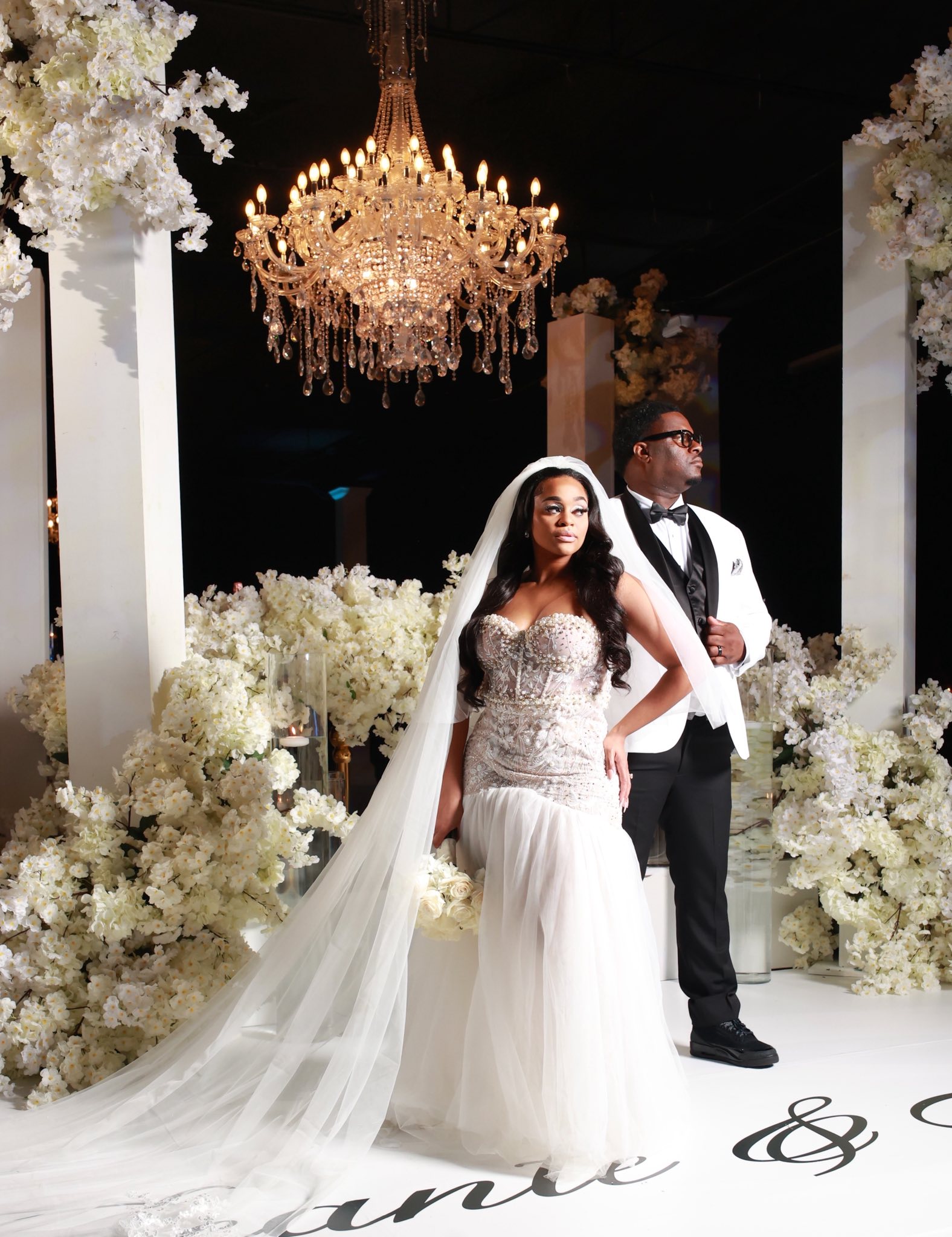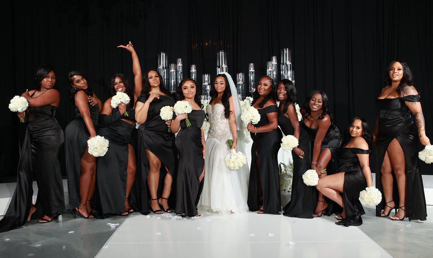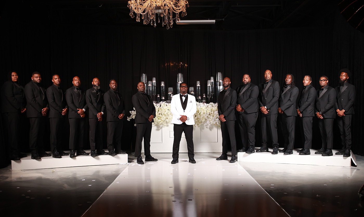 Megan and Seante were married in a wedding celebration that embodied modern luxury and showcased timeless elements. Over 300 guests donned all-black for the formal black-tie affair at The Calirojae, which was decorated with romantic draping, white florals and glittering chandeliers. Emotion and love filled the room as the bride walked down the aisle and the husband-and-wife to-be said their vows in front of their guests. After the ceremony, the space played host to an elegant cocktail hour. After all had enjoyed food and drinks, music sounded and the lively reception began. Guests took to the dance floor with the newlyweds in celebration as they danced into the night.