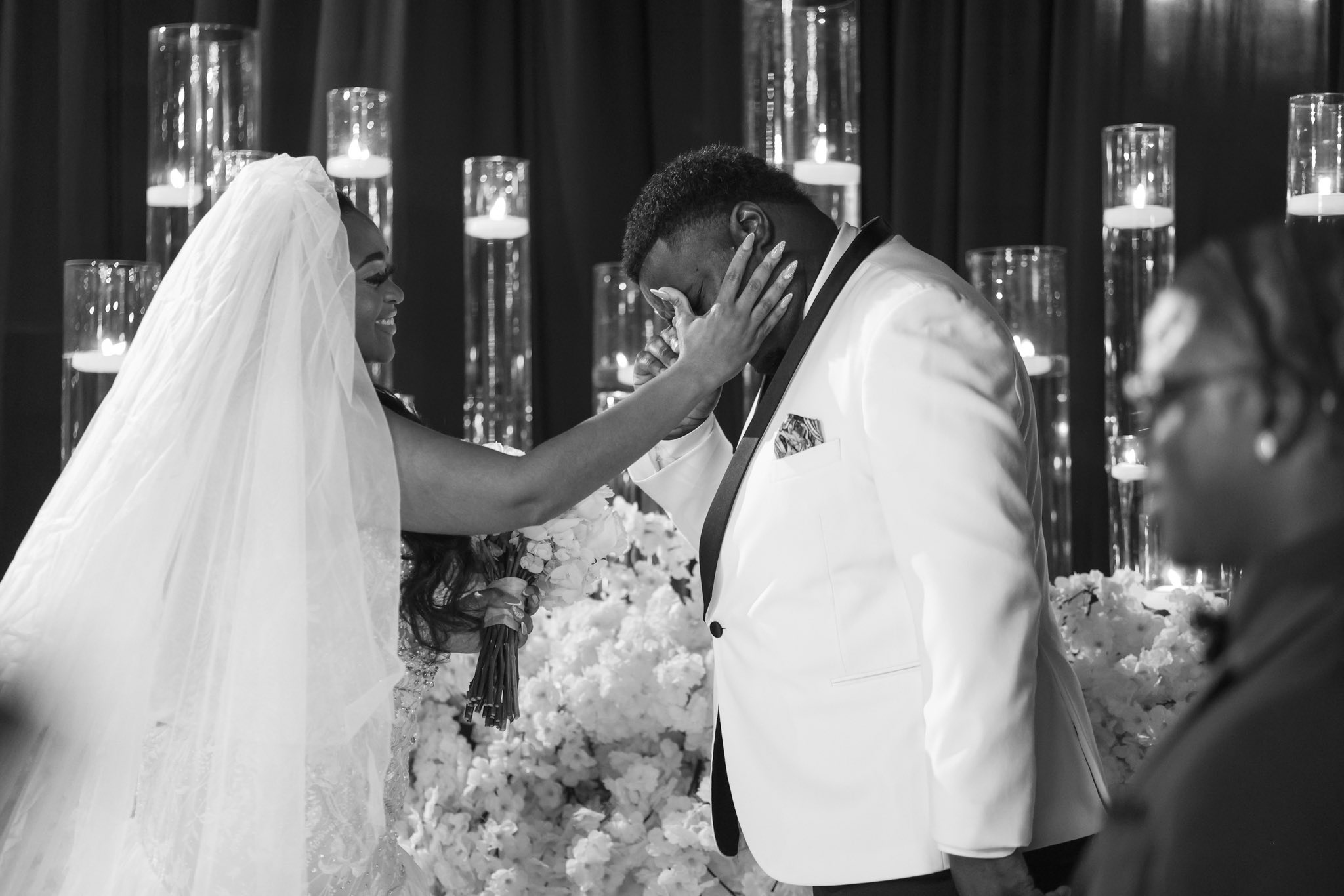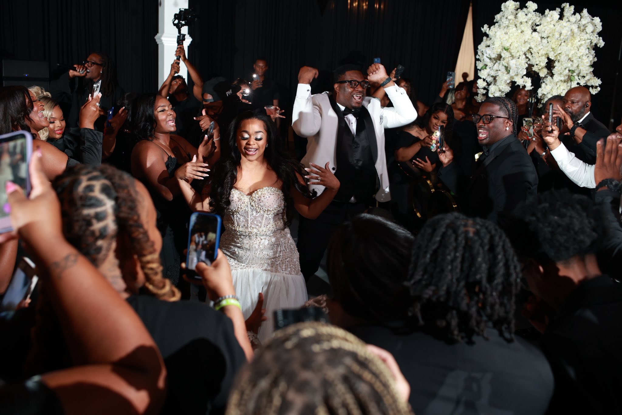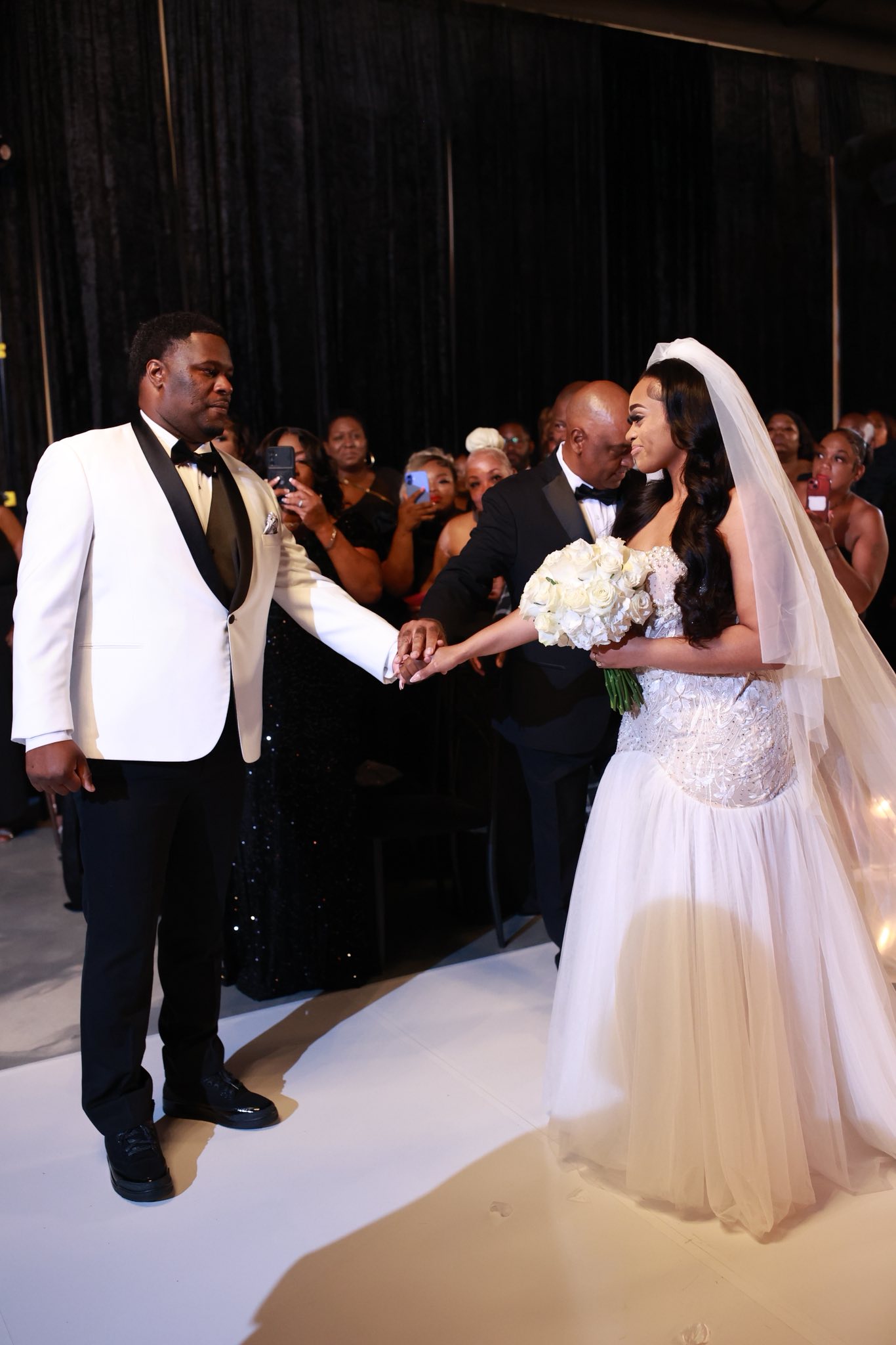 Megan and Seante were married in a wedding celebration that embodied modern luxury and showcased timeless elements. Over 300 guests donned all-black for the formal black-tie affair at The Calirojae, which was decorated with romantic draping, white florals and glittering chandeliers. Emotion and love filled the room as the bride walked down the aisle and the husband-and-wife to-be said their vows in front of their guests. After the ceremony, the space played host to an elegant cocktail hour. After all had enjoyed food and drinks, music sounded and the lively reception began. Guests took to the dance floor with the newlyweds in celebration as they danced into the night.