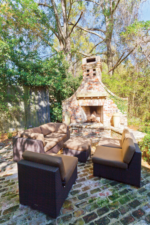 The couple designed their ideal outdoor living area, and Robert McCown brought it to life. It was all brush beforehand, but now they spend a lot of time enjoying the space. “I had to put a TV out there to watch football, ” Gardner says. “And we go through about a cord of wood a year burning fires in the fireplace.” Comfortable wicker and upholstered furniture makes the space a cozy, alfresco getaway.