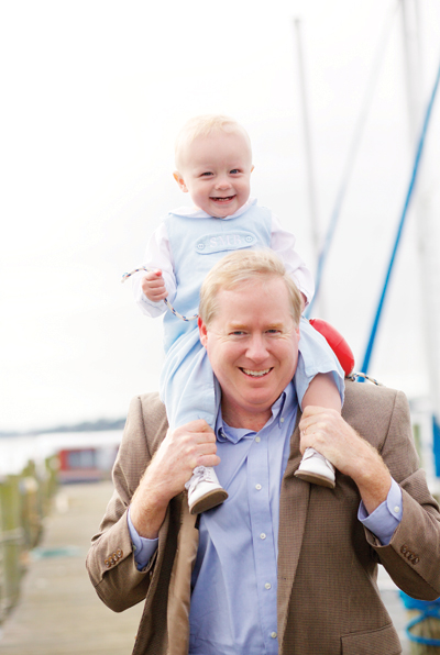 ABOVE LEFT For Buck Baker, it’s great fun to stroll atop his dad Stephen’s shoulders. “Nothing makes me happier than spending time with my family, especially my babies, Buck, 3, and Hallie Inge, 15 months, ” says Stephen. Photo by Keyhole Photo