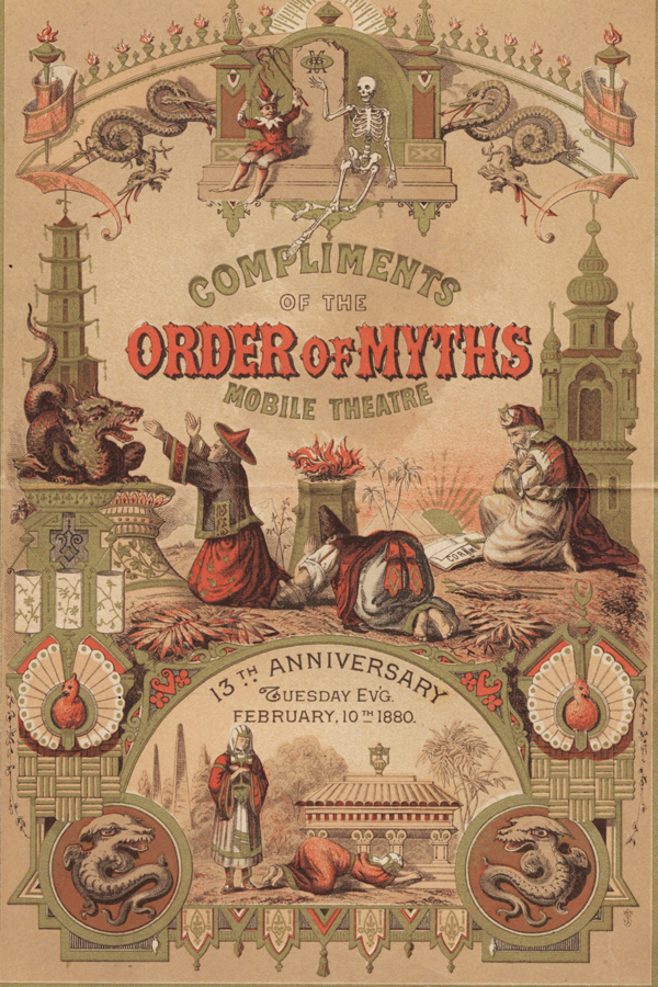 Four years after Comus formed [in New Orleans], the Civil War interrupted holiday festivities in both cities. It was just after the war that Joe Cain and his Lost Cause Minstrels appeared, part of a long evening of festivity. It was the first time that Mobile had ever recognized Mardi Gras with a public celebration. The Lost Cause Minstrels were the first to appear on the street that evening and were well received as a comical act preceding the night’s main event, the Order of Myths. The O.O.M.s, as they were called, tried to outdo even the most expensive and elaborate New Year’s Eve parades, like those of the Cowbellions.