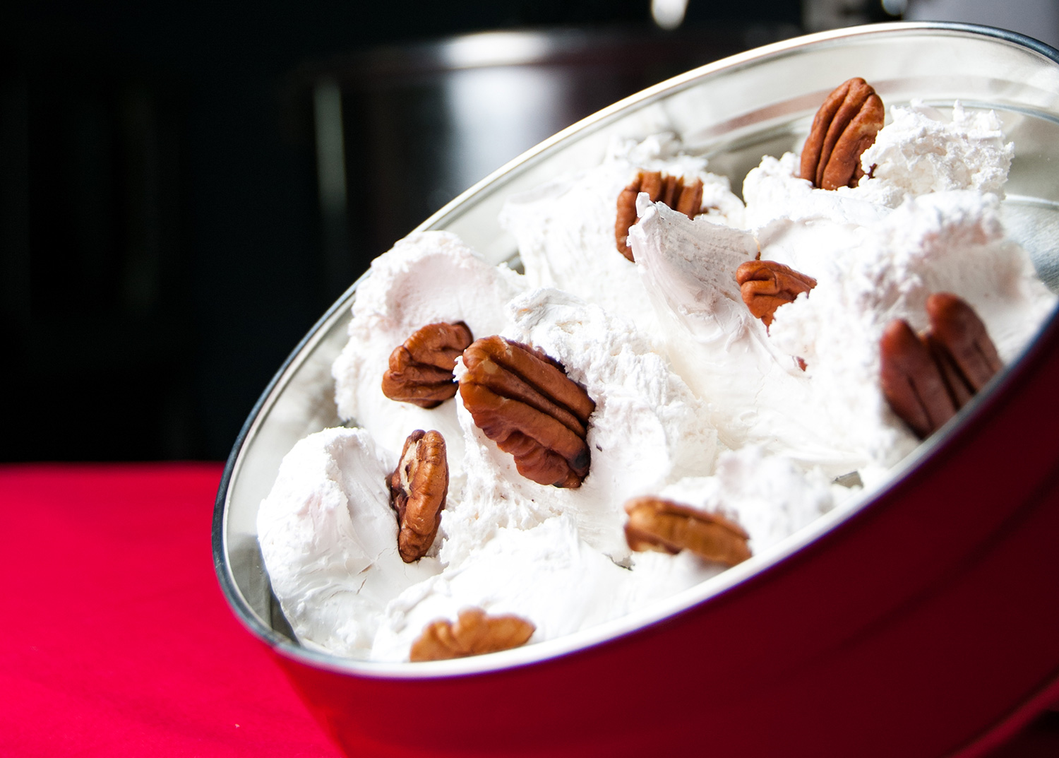 3. Continue cooking remaining syrupy mixture to 270 degrees and slowly pour over egg white mixture. Continue beating until divinity holds peaks.