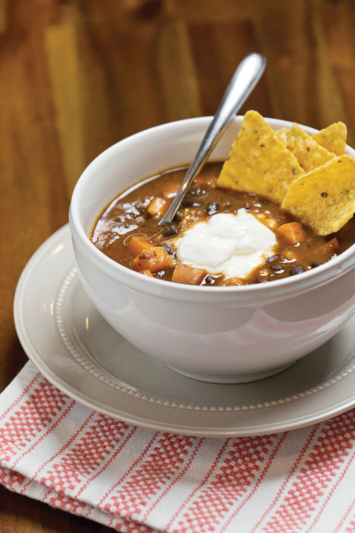 5. Remove 3 cups of the soup out of the pot and mash with a potato masher then add back to the soup and stir. Portion into bowls and top with a dollop of sour cream and chips.