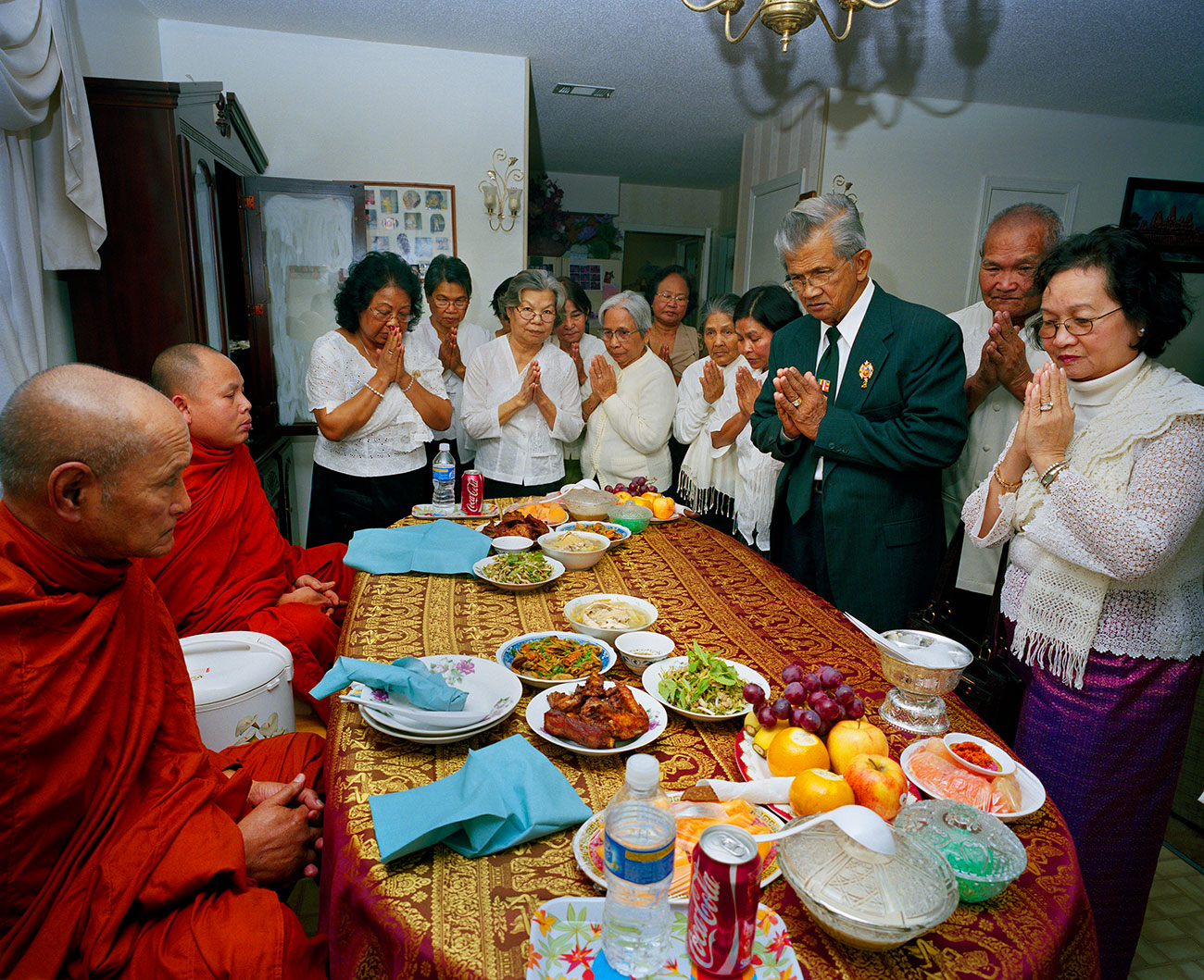 Almost a week later on the outskirts of Mobile, I heard another tongue spoken as I made pictures of the same prayerful gestures from church but now in a culturally different setting. This was a Hoji, or Buddhist memorial service, in the Irvington home of Mrs. Heak Hong, whose Cambodian husband had died one year earlier. As I snapped the shutter, the group offered a prayer over a lunch we would all share, dishes intended first for the monks, who consumed only one meal a day and must eat before noon.