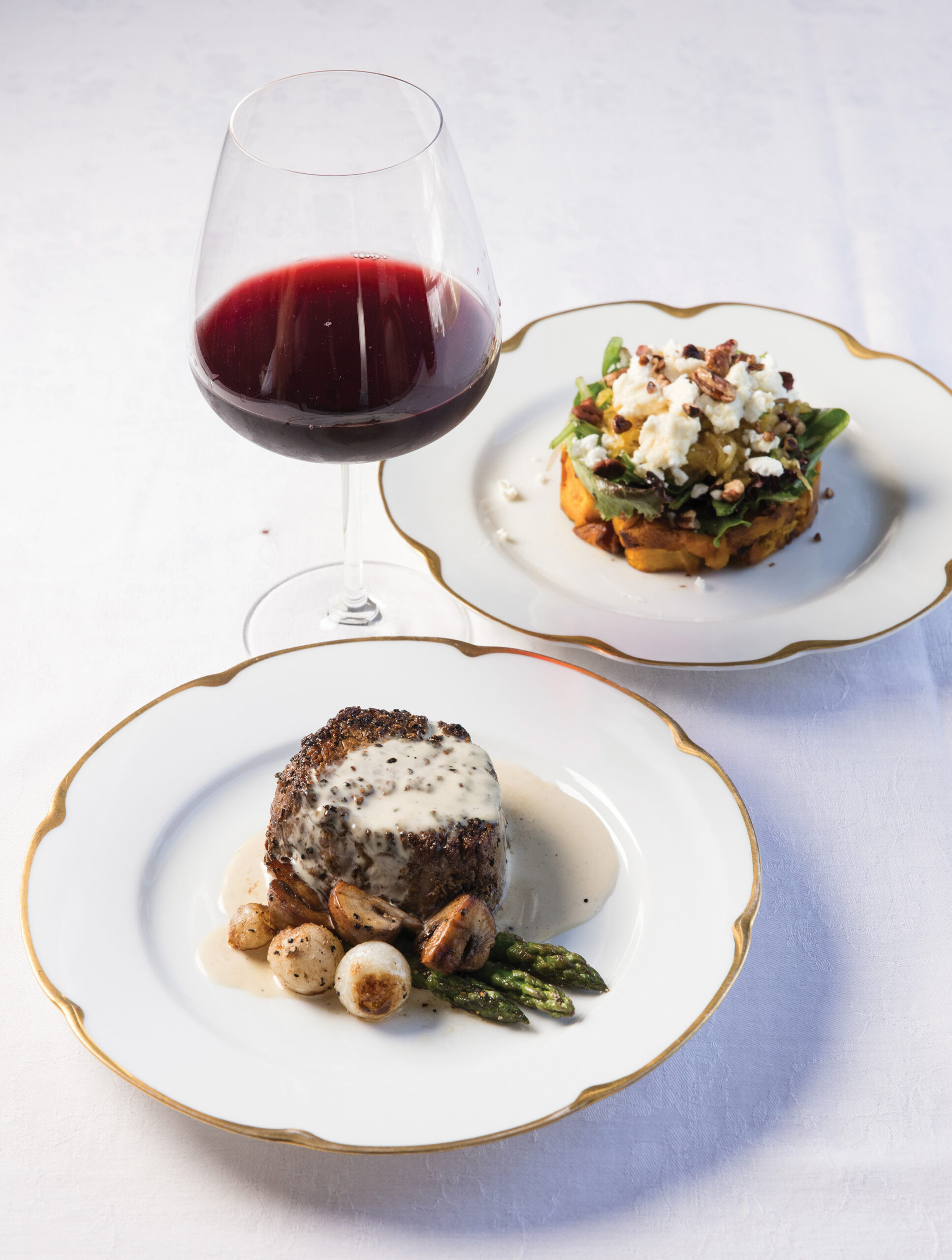 Peppercorn-encrusted, pan-seared beef is topped with a cognac cream sauce, served with potatoes and a green vegetable — asparagus