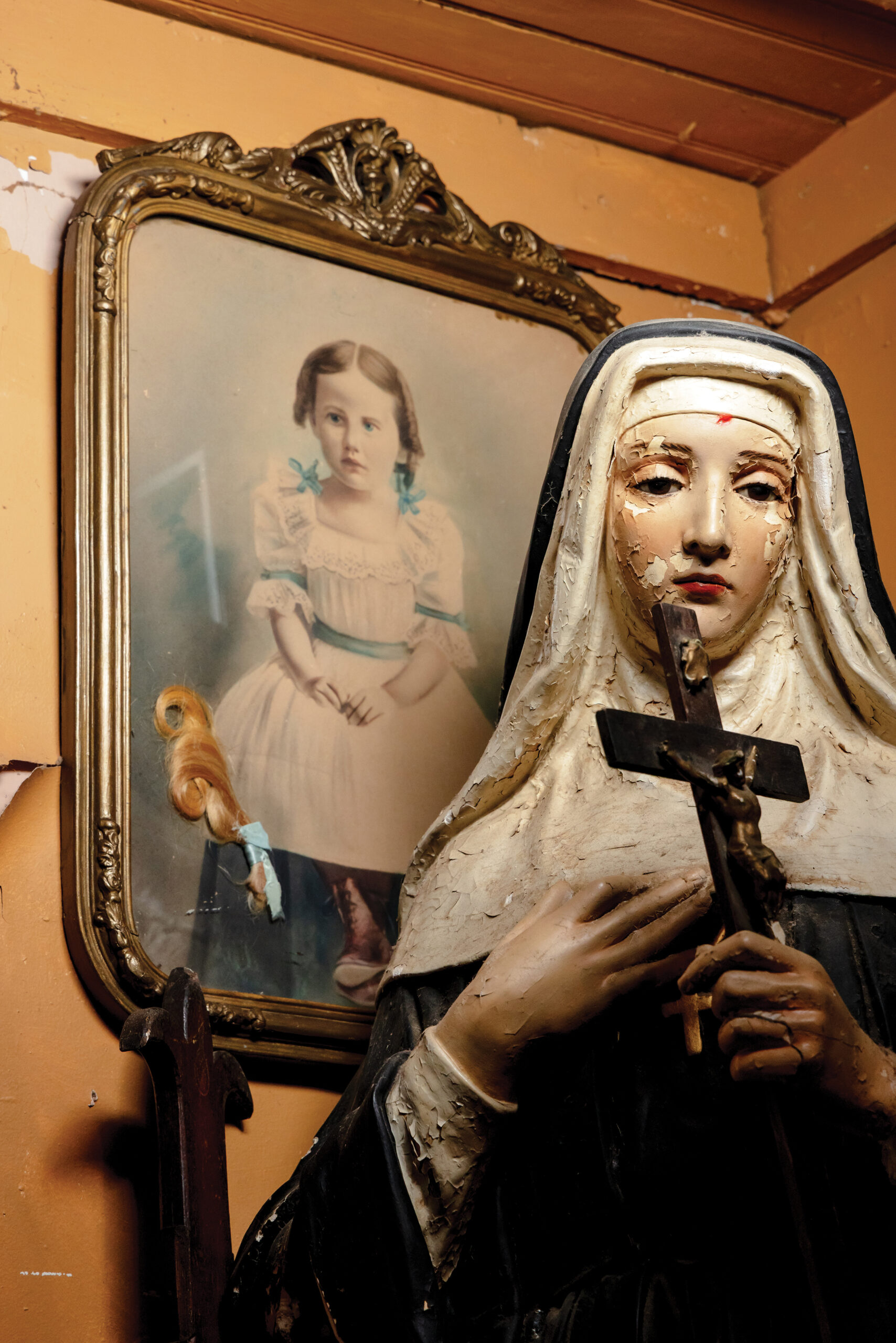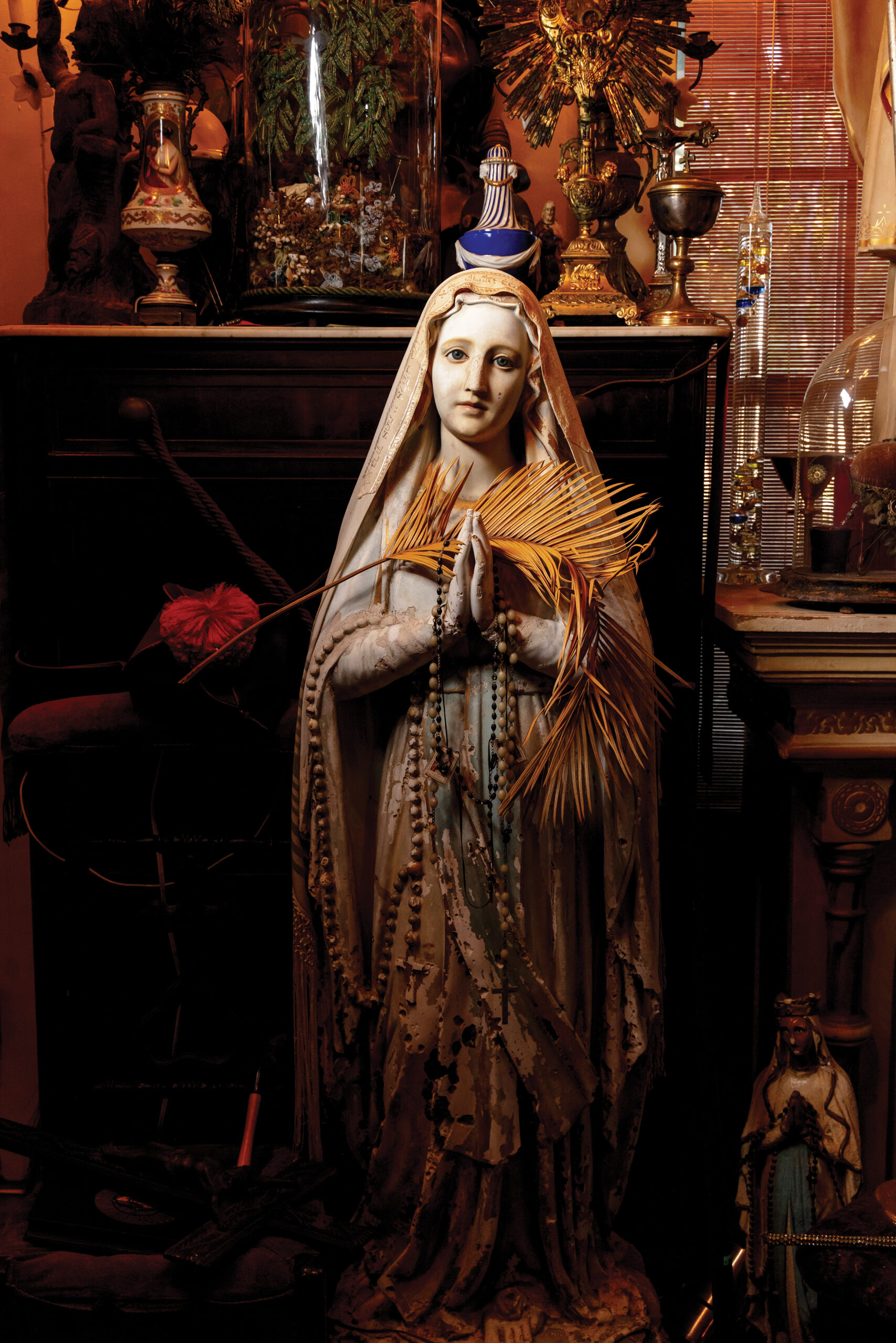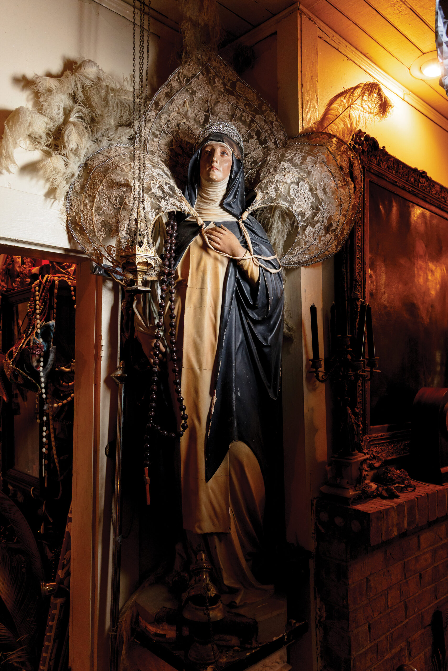 From the alligator chair — the one nobody knows if you should sit on or feed it — full view of the den is available. One is drawn to an adult size statue of The Virgin Mary, with prayerful hands and glass eyes locked on you. Her crystal gaze once raised havoc.