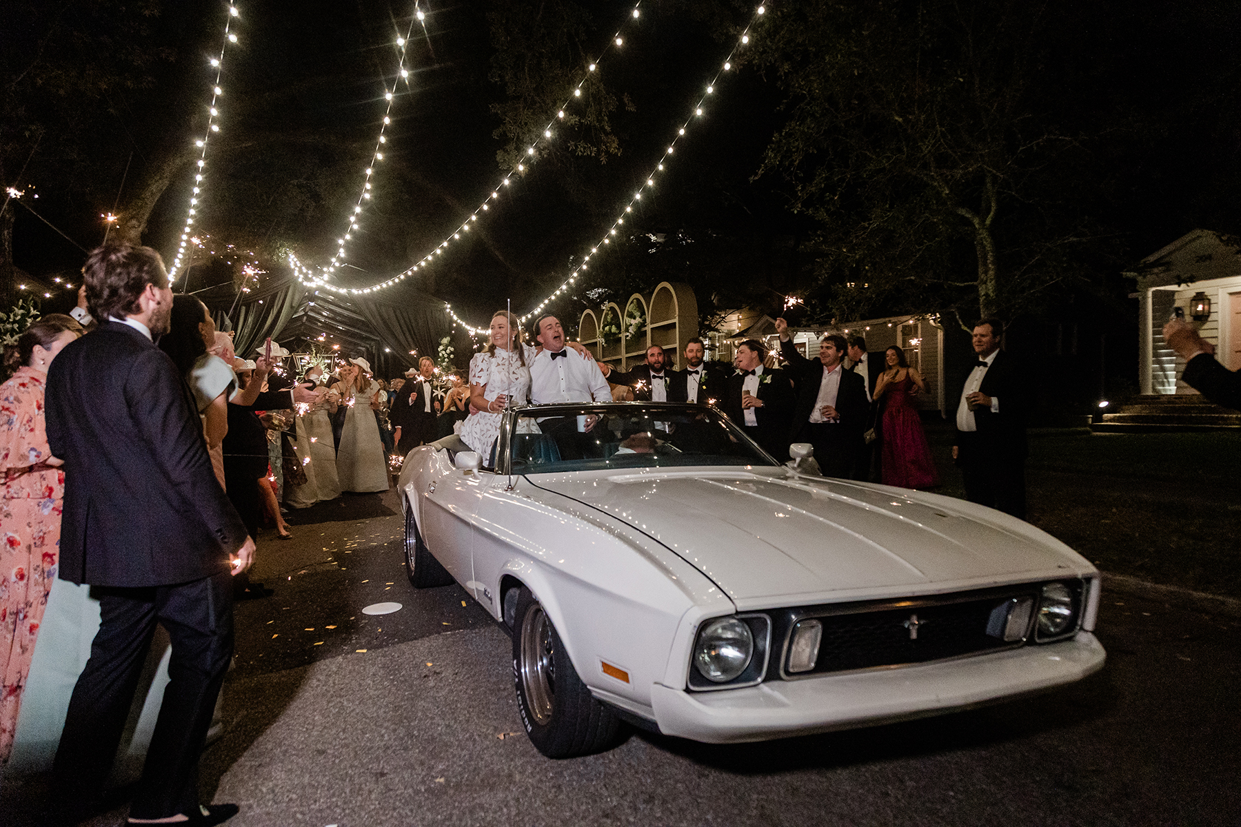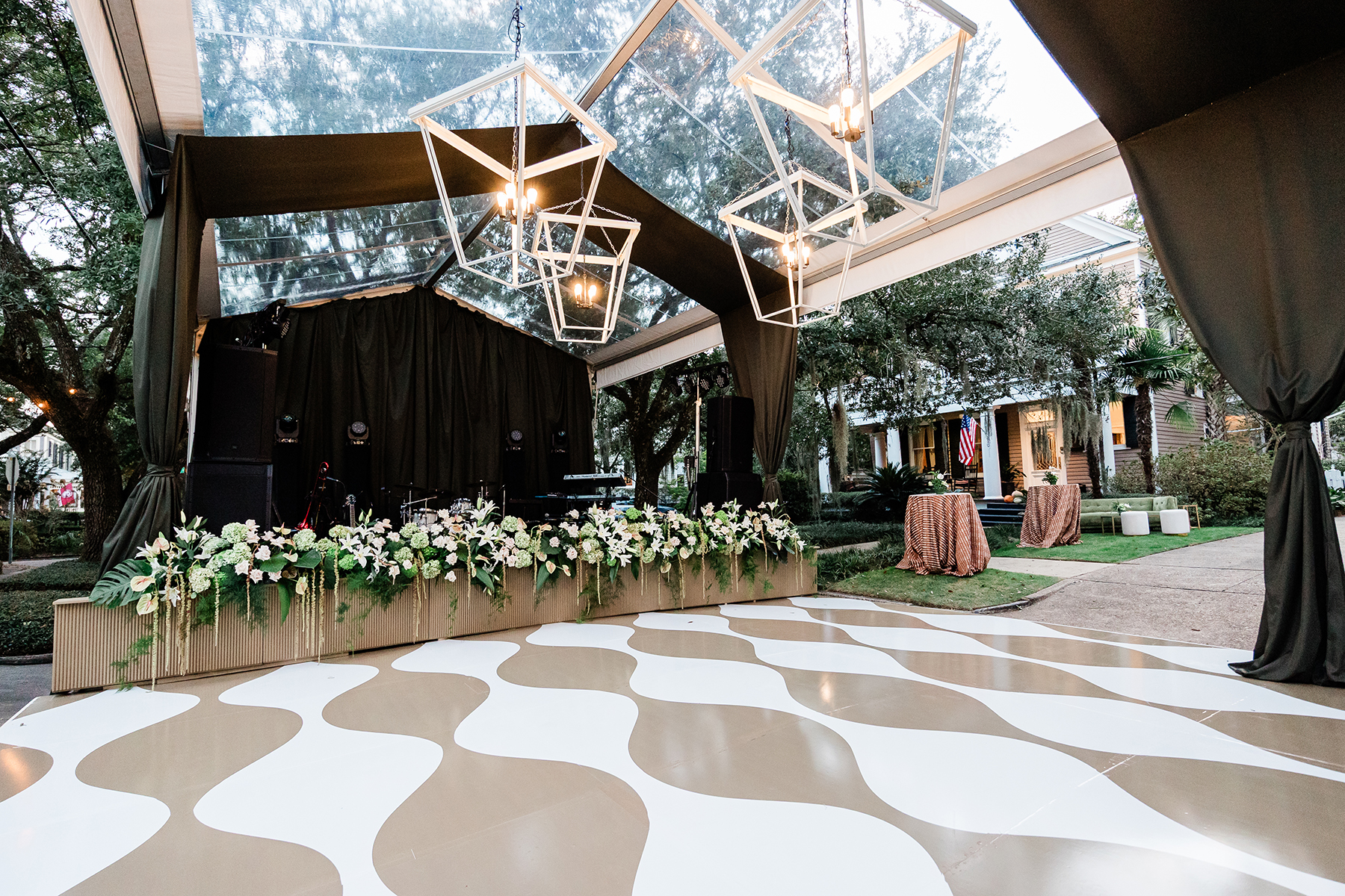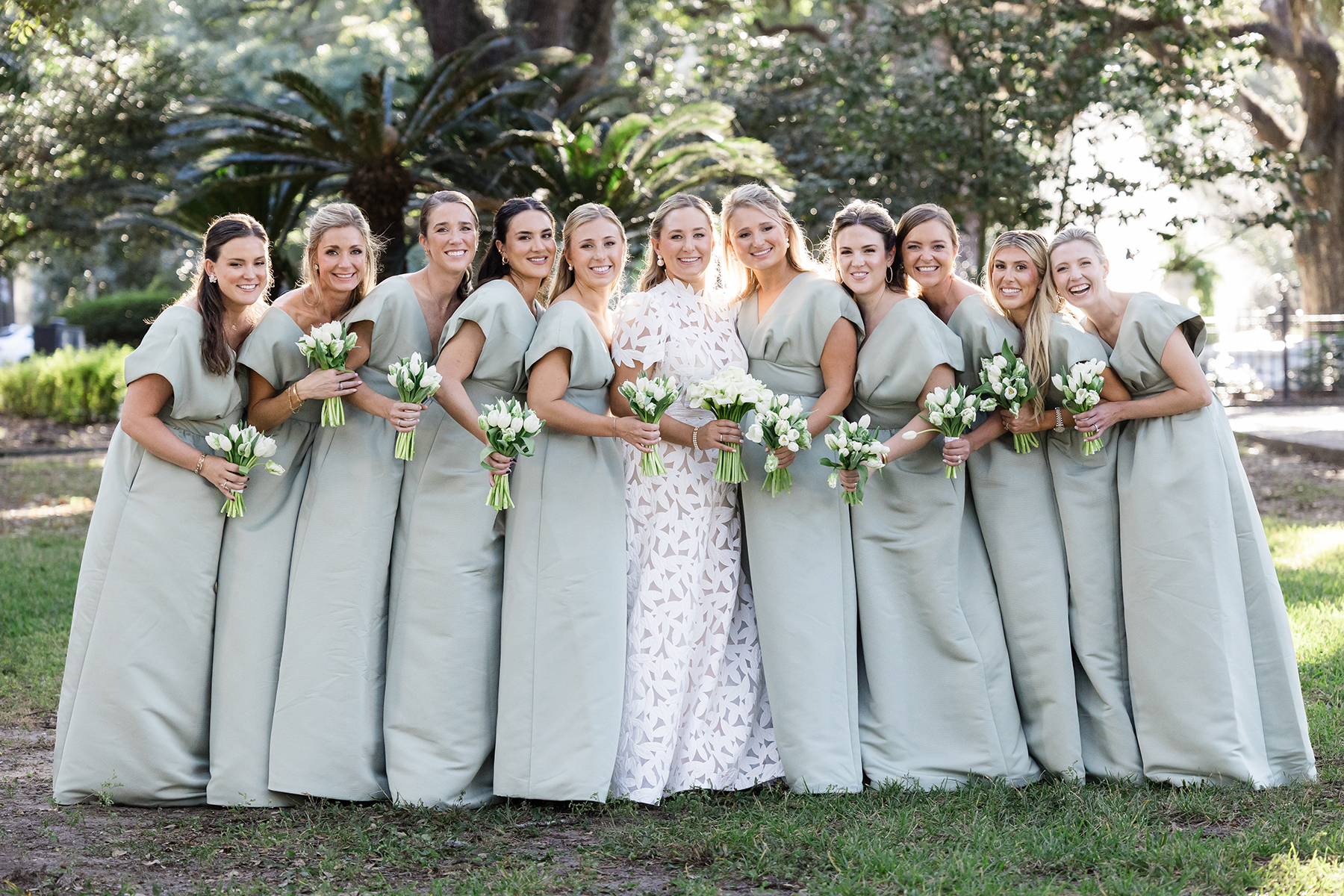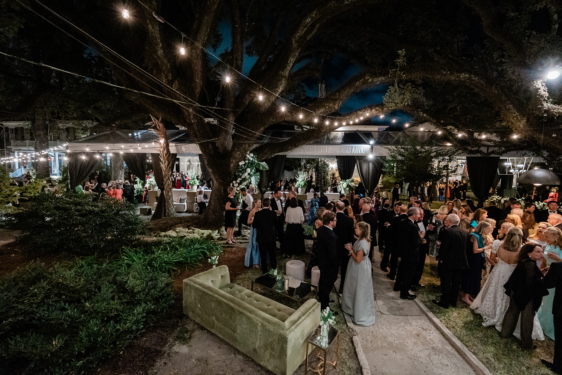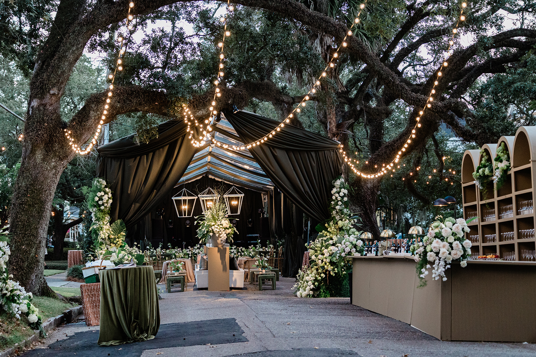 The street party reception followed in the Oakleigh Historic Garden District. The tent featured olive-green draping and floral arrangements placed on tall columns running down the center, with tables and bars scattered in the neighbors’ yards. The band kept everyone on the dance floor all night long, with late-night pizza and Chrissy’s keeping the party going well into the evening.