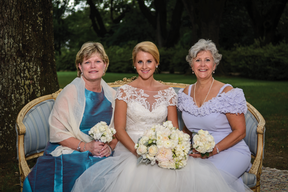 In keeping with tradition, the bride wore a waltz-length veil embellished with lace and pearl that had been previously worn by both her mother and sister. The bride carried a bouquet of cream and blush peonies,  hydrangeas and roses created by Belle Bouquet Florist.