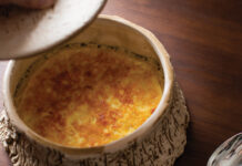 Meg Mattei makes this corn pudding recipe every Thanksgiving in her adorable tree stump pottery dish.