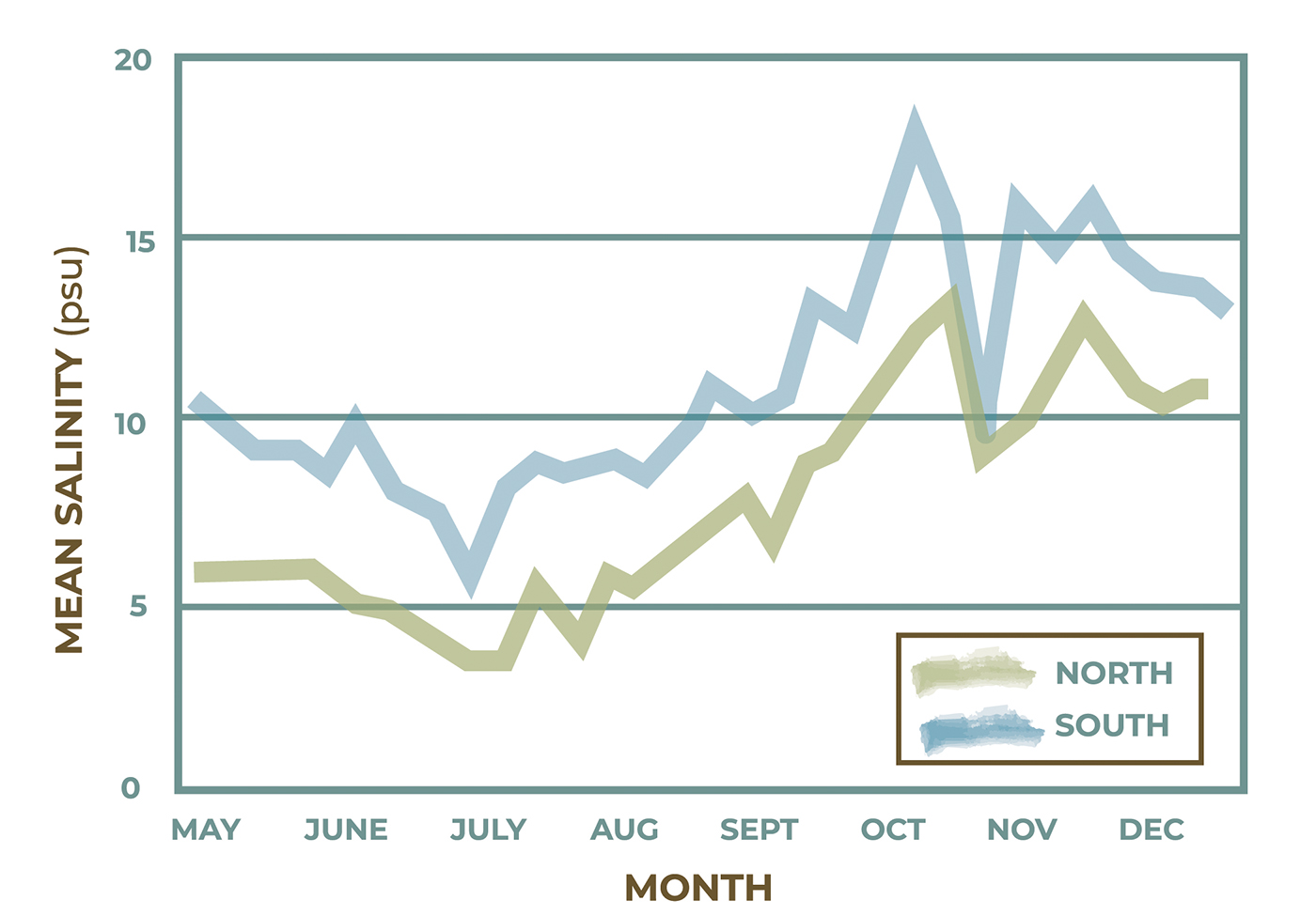 Above Graph Dr. Charlie Martin, Assistant Professor in the Department of Marine Sciences at the University of South Alabama, as well as Senior Marine Scientist at the Dauphin Island Sea Lab, says this graph shows the “salt wedge” that develops in the Bay during the Fall that is responsible for the increased number of saltwater species caught off the Causeway at that time of year.