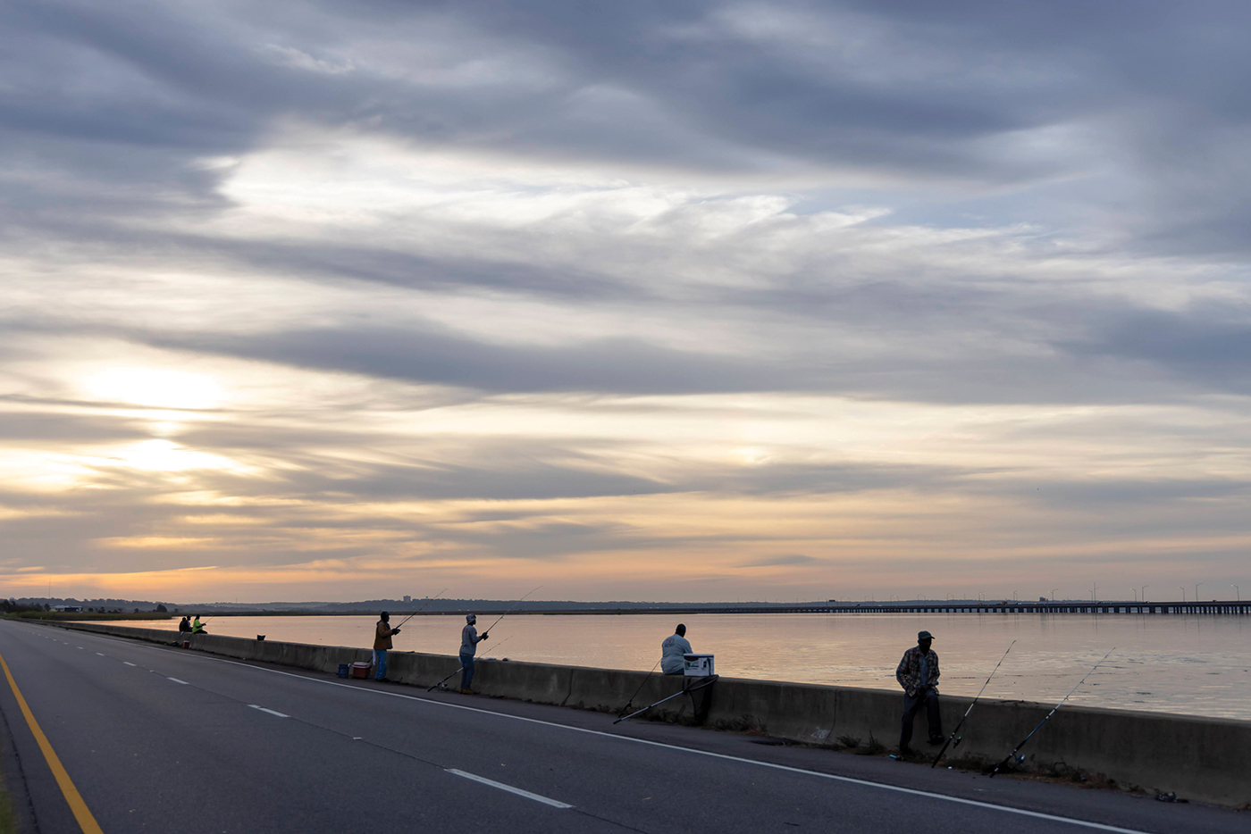 I dust off my ego, and we say goodbye to Frank and Jimmy and ride a little further down the Causeway toward the Eastern Shore, hoping to find one last fisherman before heading home. I spot a man and a woman who appear to be together, but also not, fishing about 100 feet apart from each other on the same side of the road. I pull over and slowly walk toward the woman first, but the look on her face tells me this is going to be a short one. I introduce myself and give my writer spiel. She tells me she and her husband live in Fairhope, and they both work full time, her husband in retail where he talks to people all day, so they really need this, the quiet and the peace of mind Kikie mentioned earlier. I take the hint and leave them to it. As I climb in the car, I stop for a second to watch their fishing lines dance through the air, like delicate spiderwebs being flung out across the glassy stare of the water’s surface.