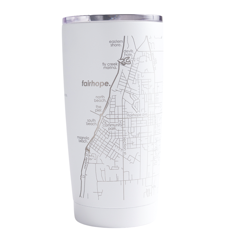 20-ounce Fairhope map tumbler • $30, Black Door Studio