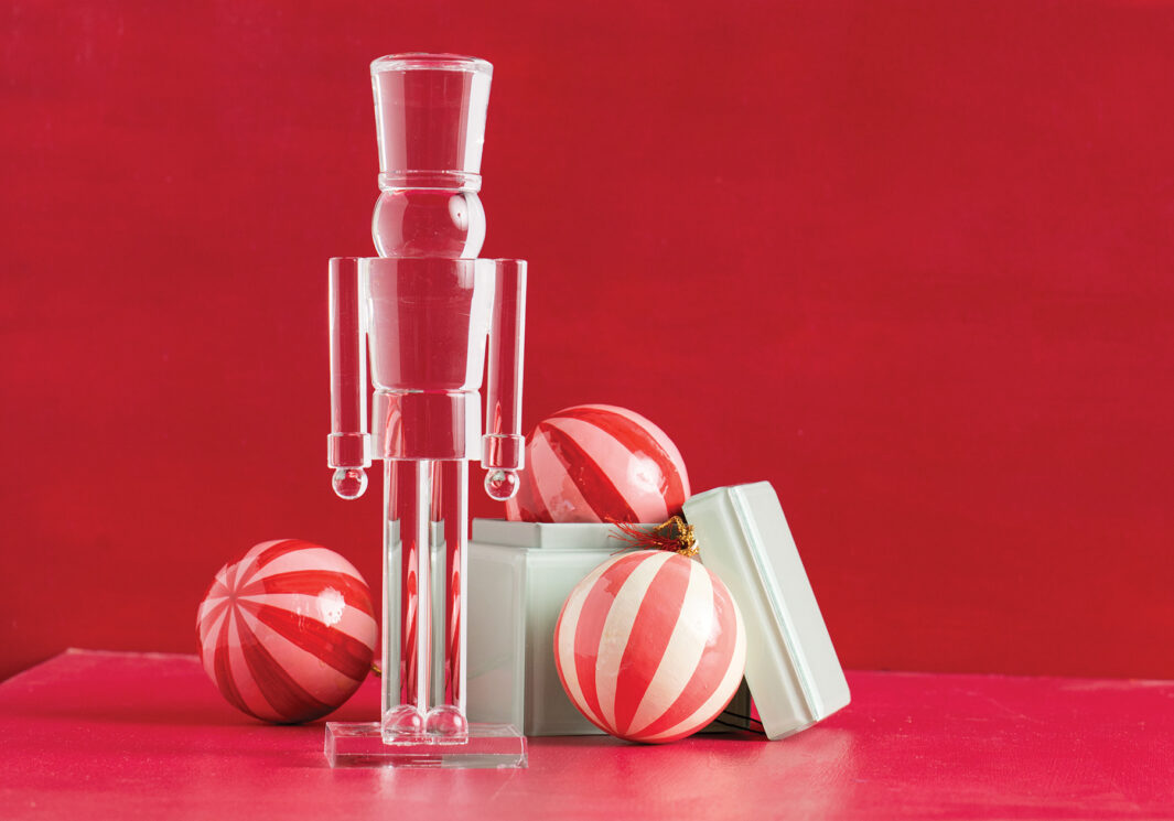 10-inch acrylic Nutcracker • $31, Five Gold Monkeys // 3-inch Paper Mache Ornaments • $7 each, Wildflowers // Teal glass box by Glitter Ville • $48, The Holiday