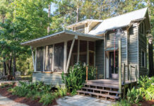 Everything about Susan and Tom Taul’s new bayfront home in Fairhope was designed for easy family living. The large open living space can accommodate piles of grandkids around the kitchen island while Susan makes roux and Tom picks crabs for a big pot of gumbo. The guest bathroom, with split brick floors, opens right to the pool area so grandkids can come in without dripping a trail of water across the living room. With several guest bedrooms and a carriage house to boot, there is a bed for anyone who wants to stay. The house has countless options for a comfortable spot to sit or swing and watch the water. Every seat seems to have a good view.