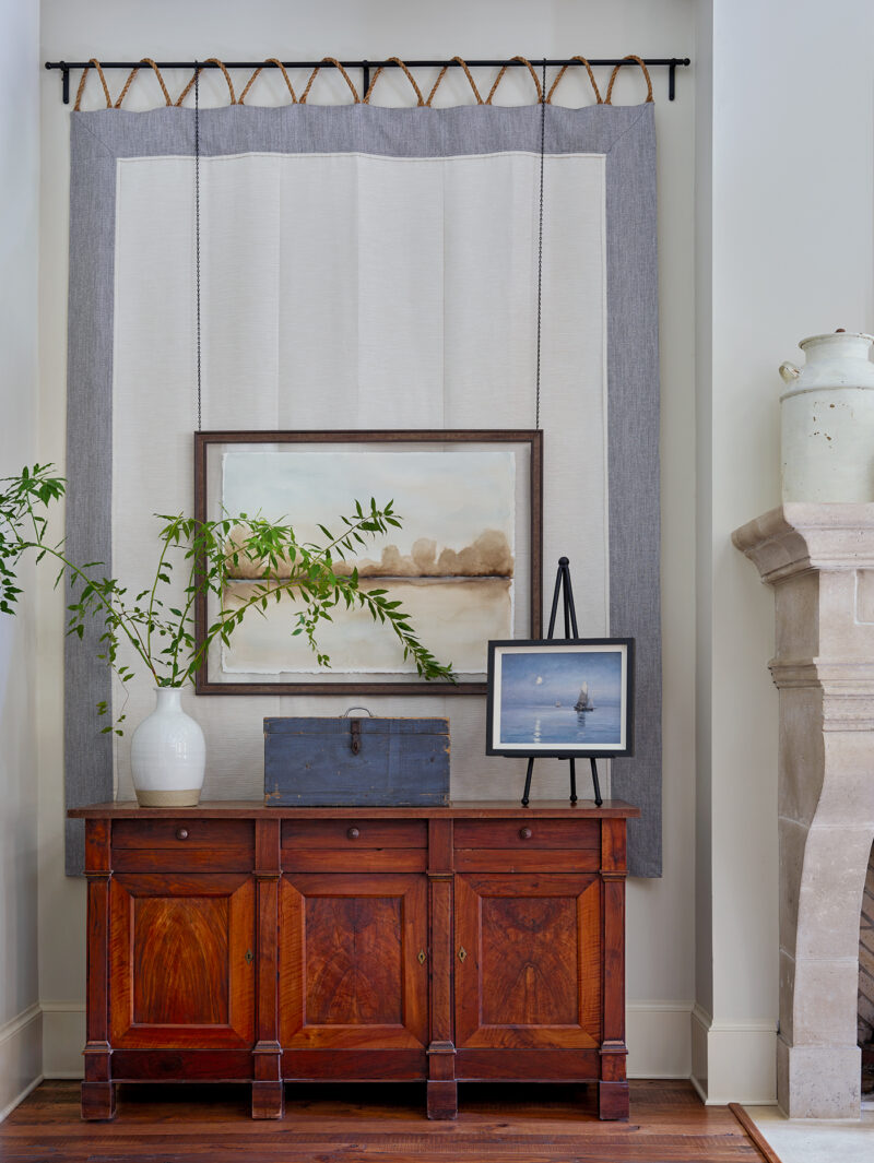 “Over the antique chests flanking the fireplace, we suspended a fabric wall hanging to aid in reducing the scale of the mantel and the ceiling height.”