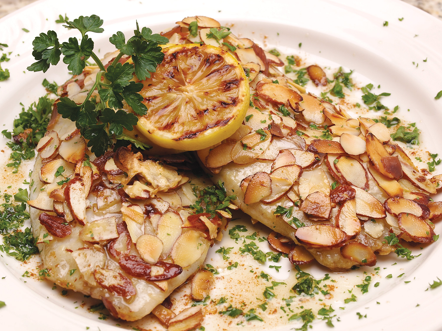 7. Place the fried fillets on warm buttered platters. Squeeze the lemons over the fillets. Sprinkle with toasted almonds. Drizzle with the remaining melted butter and sprinkle with parsley.